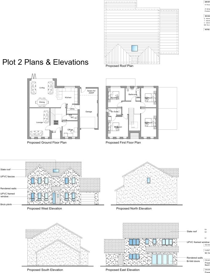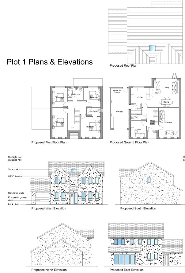According to the planning permission, each plot comprises a detached dwelling with an adjoining single garage. The properties include a kitchen diner, living room, study, utility room and WC to the ground floor, and four good sized double bedrooms, one with an en-suite, and a family bathroom to the first floor.