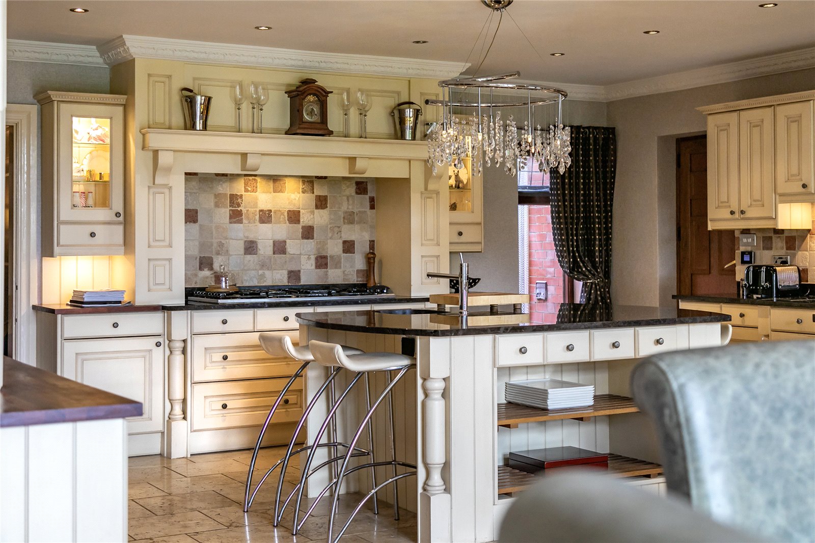 The dining area also has views over the gardens and grounds and is open to the kitchen space. There is a painted Applethwaite fitted kitchen with complimentary central island incorporating a breakfast bar and granite work surfaces. A 1.5 sink is provided along with integrated appliance including 3 ovens, microwave, dishwasher, gas hob with extractor over and a point for an American fridge freezer. This is a lovely family room and is likely to be the heart of the home.
