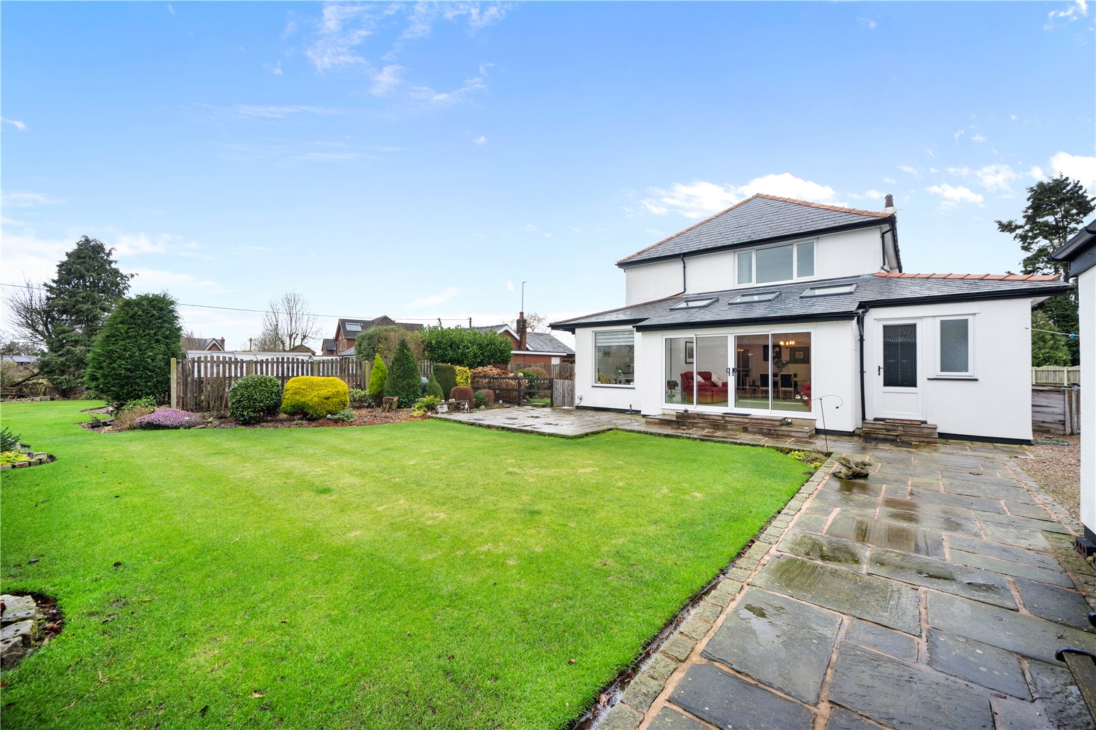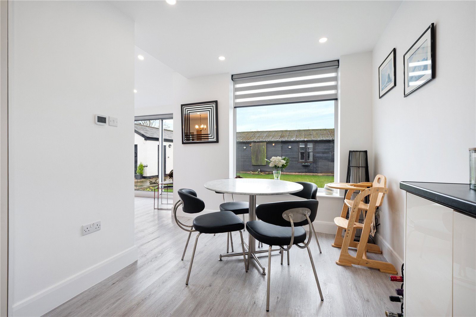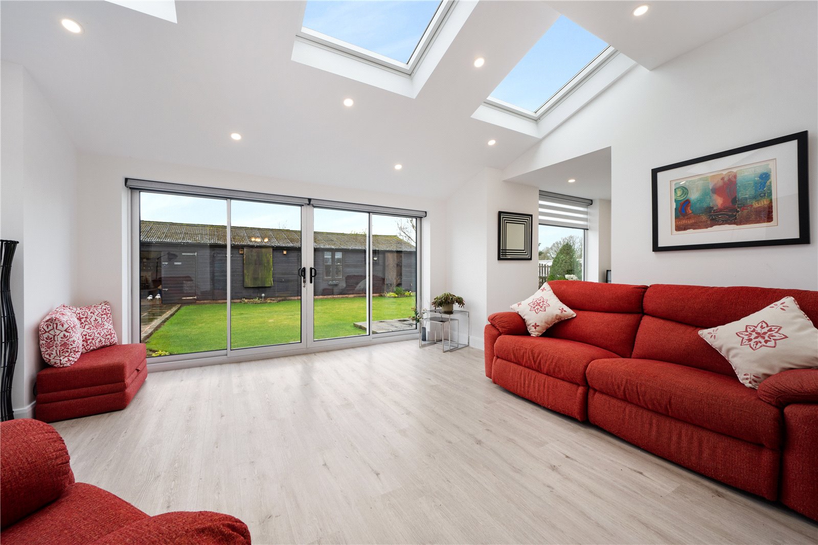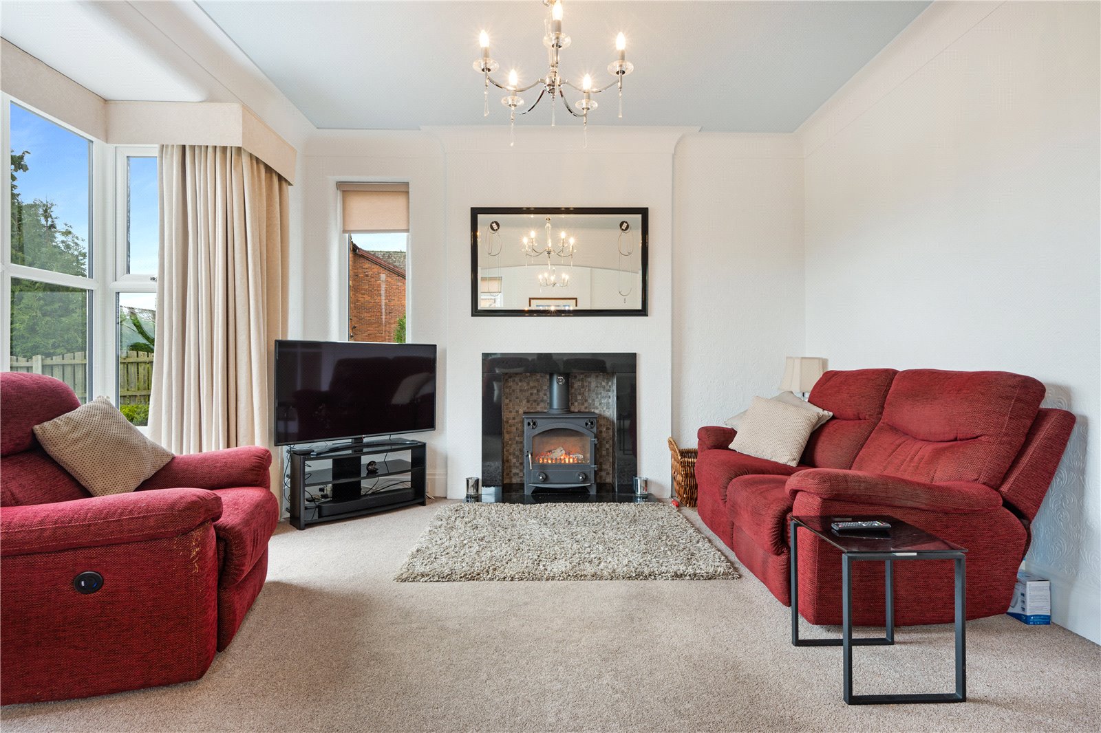 Internally, the accommodation is notably generous and arranged around a welcoming central hallway, creating a natural flow between the principal living spaces. The formal living room enjoys twin walk-in bay windows and a striking log burner, while additional reception spaces include a garden room flooded with natural light, a formal dining room ideal for entertaining, and a further lounge providing excellent versatility for modern family life.