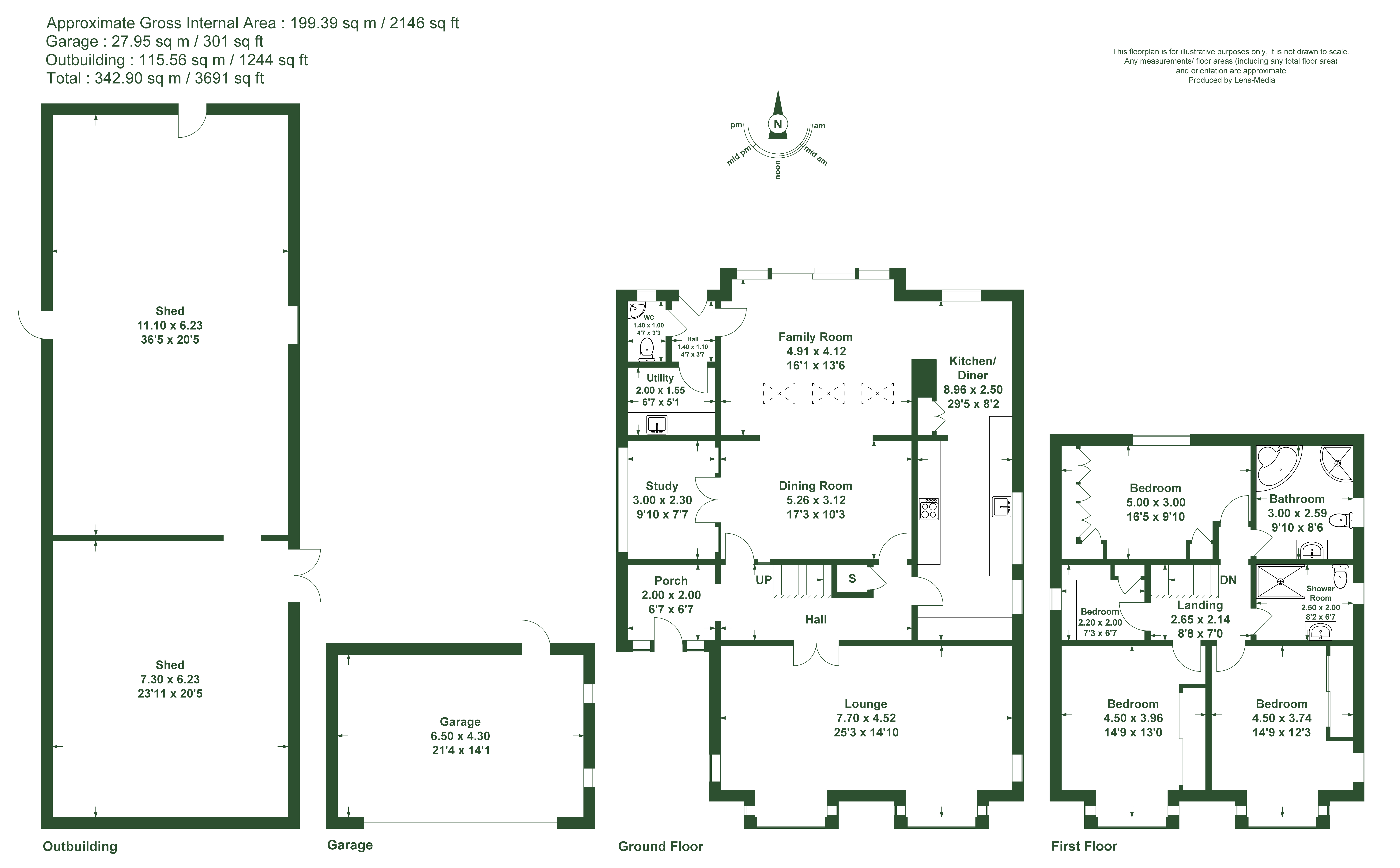 To the first floor are four well-proportioned bedrooms, three with fitted wardrobes and open views across the surrounding countryside, served by a four-piece family bathroom and an additional modern shower room. Externally, the beautifully maintained wraparound gardens offer a peaceful and private setting, while the detached garage and extensive outbuildings provide outstanding potential for storage, workshops or home business use.