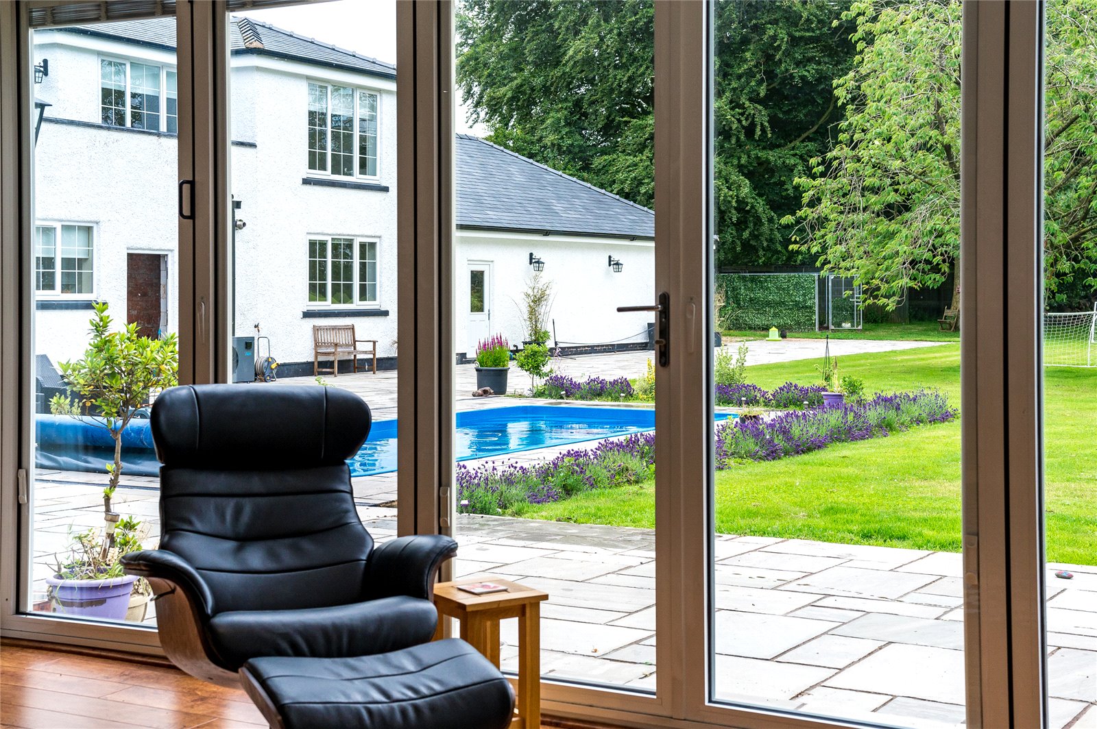 The formal lounge is nicely tucked away and enjoys an attractive fireplace creating lovely focal point. This room offers views to the front and rear and is a wonderful bright space. Beyond is a large office space with separate kitchenette and shower room along with a room used as a gymnasium to the side. There is flexibility for the buyer to use this space to suit them and has some potential to create annex accommodation on a single level. There are doors from the gym into the garage.