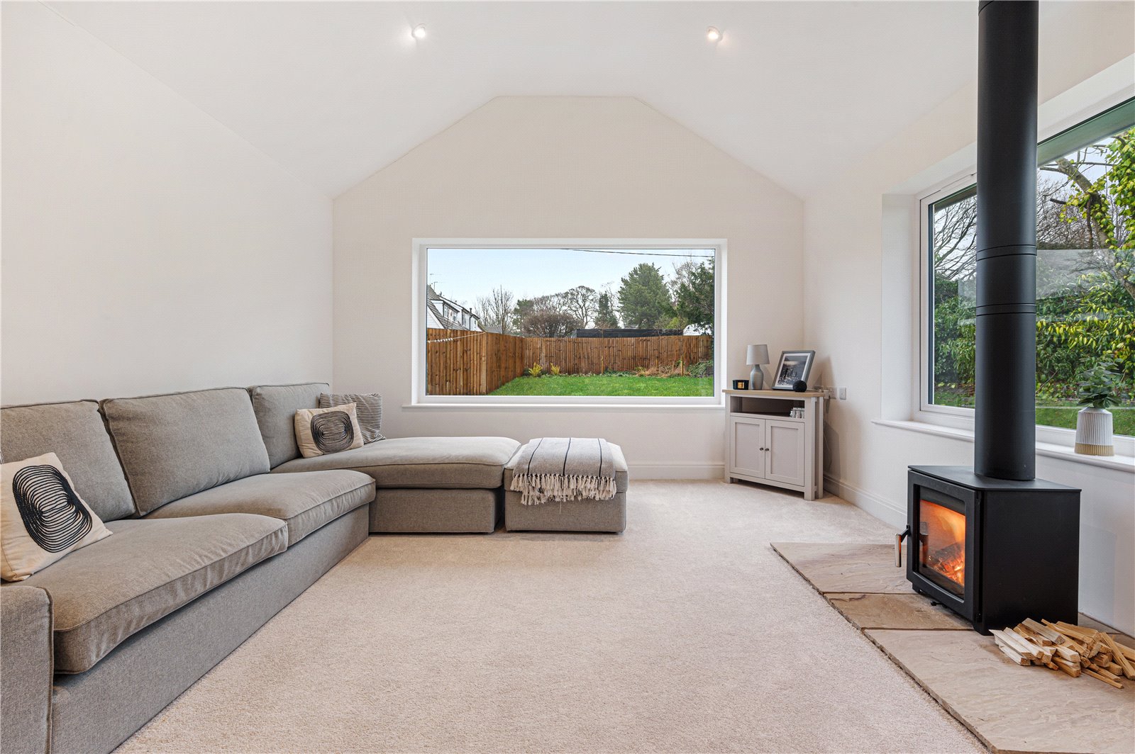 This fantastic home features an open-plan kitchen/dining room looking out onto the rear garden though aluminium bifold doors. The wonderful kitchen space is open to the living area with a cosy wood burning stove and large windows showcasing fantastic dual aspects. The essentials are covered with a utility room, pantry/store and WC on the ground floor and a further separate living room with sliding sash windows.