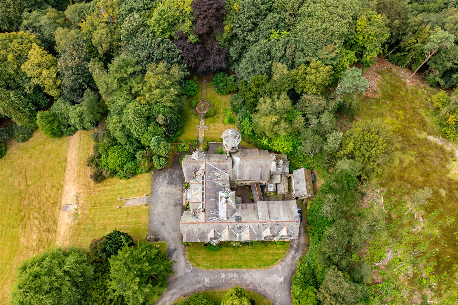 Approached via a half-mile long driveway through mature woodland, the estate extends to approximately 50 acres, predominantly broadleaf amenity woodland, interspersed with the picturesque Duddel Brook. The formal gardens immediately surrounding the house feature manicured lawns—once likely a croquet or tennis lawn—framed by vibrant herbaceous borders, rhododendrons, azaleas, camellias, and other specimen trees that reflect the property’s historic cultivation. A Grade II listed stone gateway and wall enclose what was formerly the kitchen garden, now a charming pinetum.