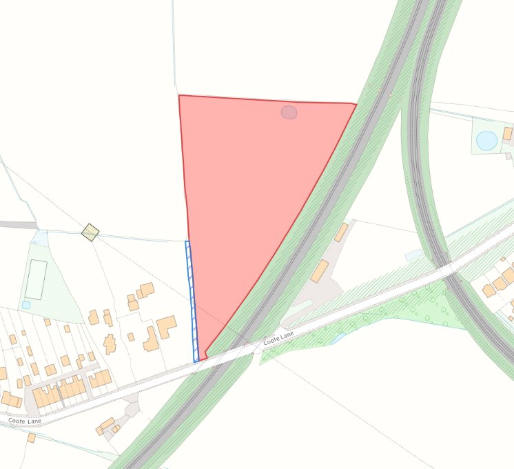 The land immediately adjoins the West Coast mainline to the eastern boundary, and to the north is bordered by hawthorn hedging. To the west is partially unfenced with the ownership of the blue hatched area being held for a full right of way for the adjacent land owner. Gated access onto Coote Lane.
