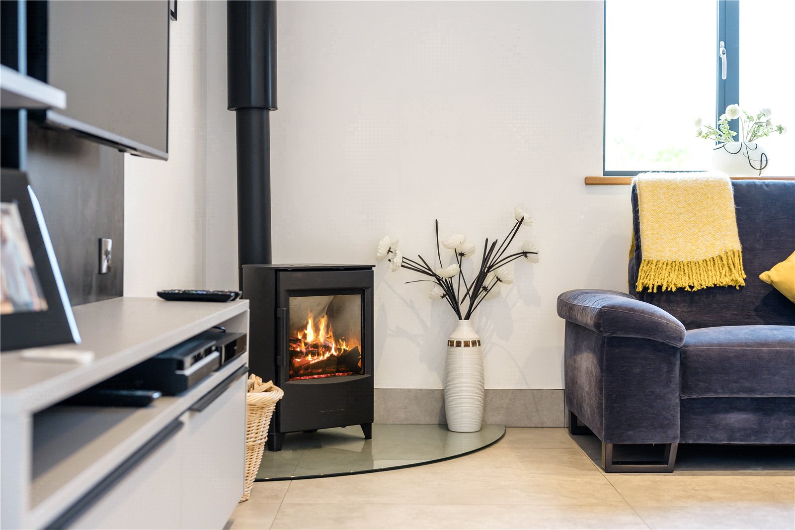The study and utility room are located off the living kitchen. The main lounge is another lovely bright space with a large window to the courtyard area at the rear. A woodburning stove is found in the corner, again providing a lovely focal point to the room.
