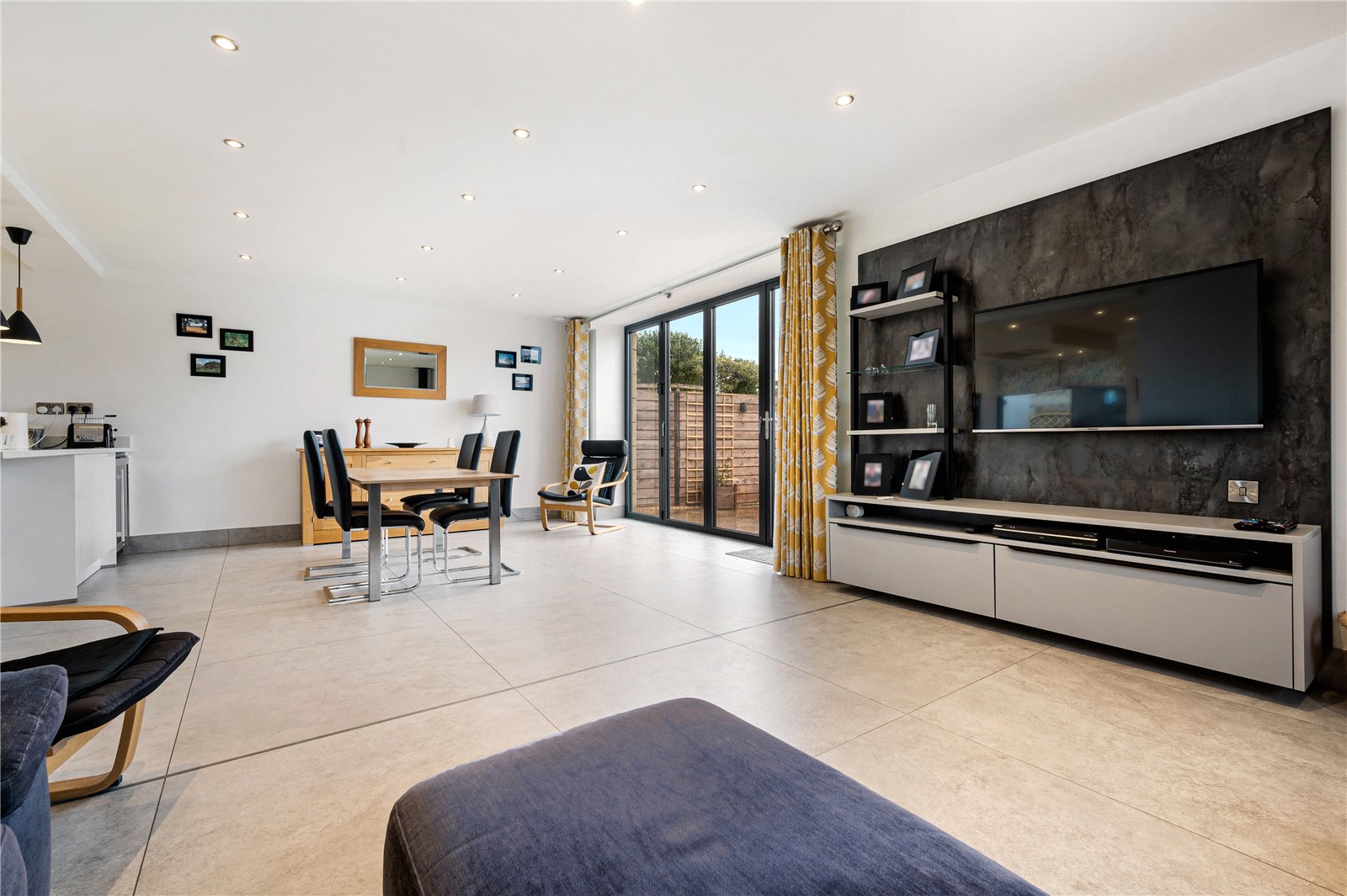 The kitchen incorporates a range of integrated appliances. Large bi-fold doors lead out to the patio to the side and a contemporary woodburning stove is found in the corner of this room giving a cosy feel to the living area.