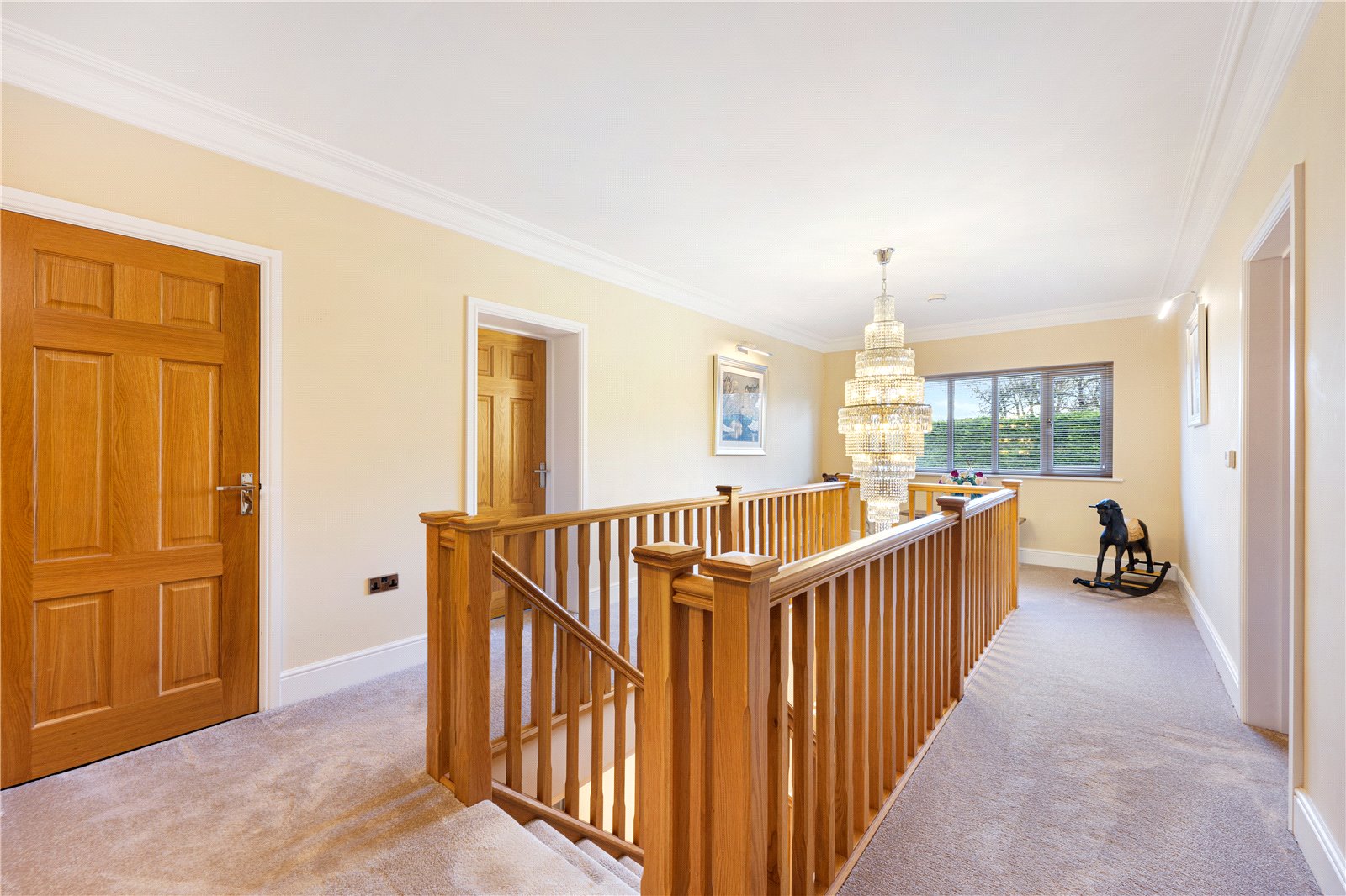 As you ascend the beautifully crafted Oak staircase to the stunning gallery landing, you will discover a layout meticulously designed for both space and privacy. The master suite stands out as a true sanctuary, with windows that invite an abundance of natural light. This retreat features a bespoke dressing room, clever integrated eaves storage, and air conditioning for year-round comfort.