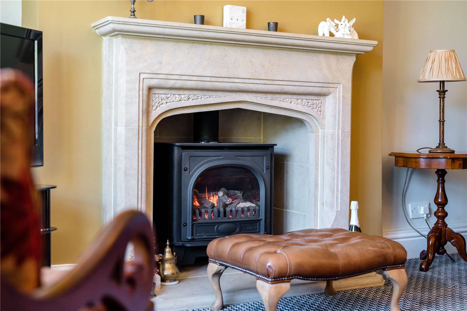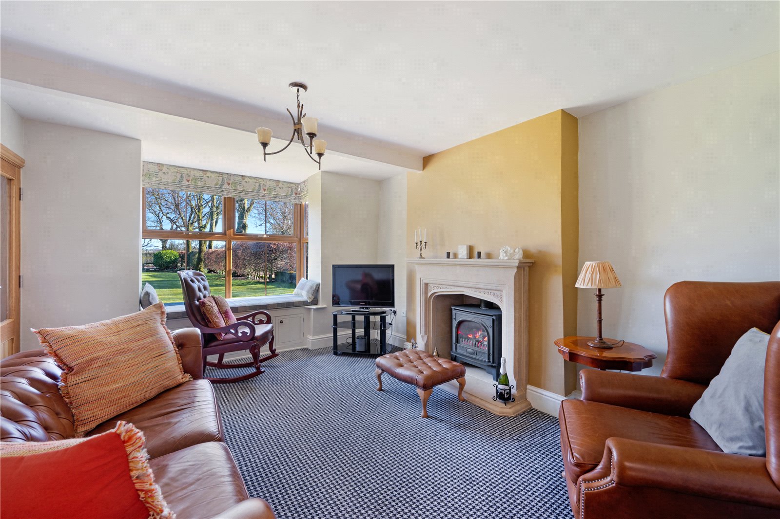 The Lounge also has a square bay window to the front and has a woodburning style stove set in a stone surround, again creating a cosy feel.