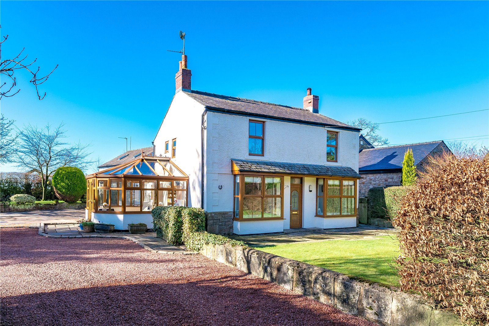 Set in a spacious plot which is evident from the drive with gardens both sides of a beech hedge. The gravel drive leads to a spacious parking area at the side of the property and ahead of the double garage. The attractive main house is double fronted with gardens at the front. Day to Day access is taken through the conservatory at the side. This is a lovely room, which has patio doors and enjoys views over the gardens. A fully glazed door leads to the inner hall which has an oak floor and doors off to various ground floor rooms