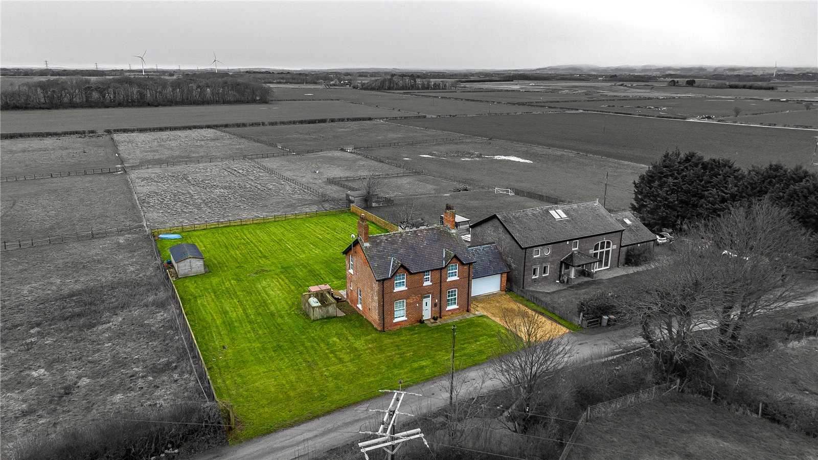 Externally, set within 0.5 Acres, the gardens wrap around the property, with a generous lawn and an Indian stone terrace taking full advantage of the open views. A detached garage provides additional storage and parking, complemented by a private driveway.