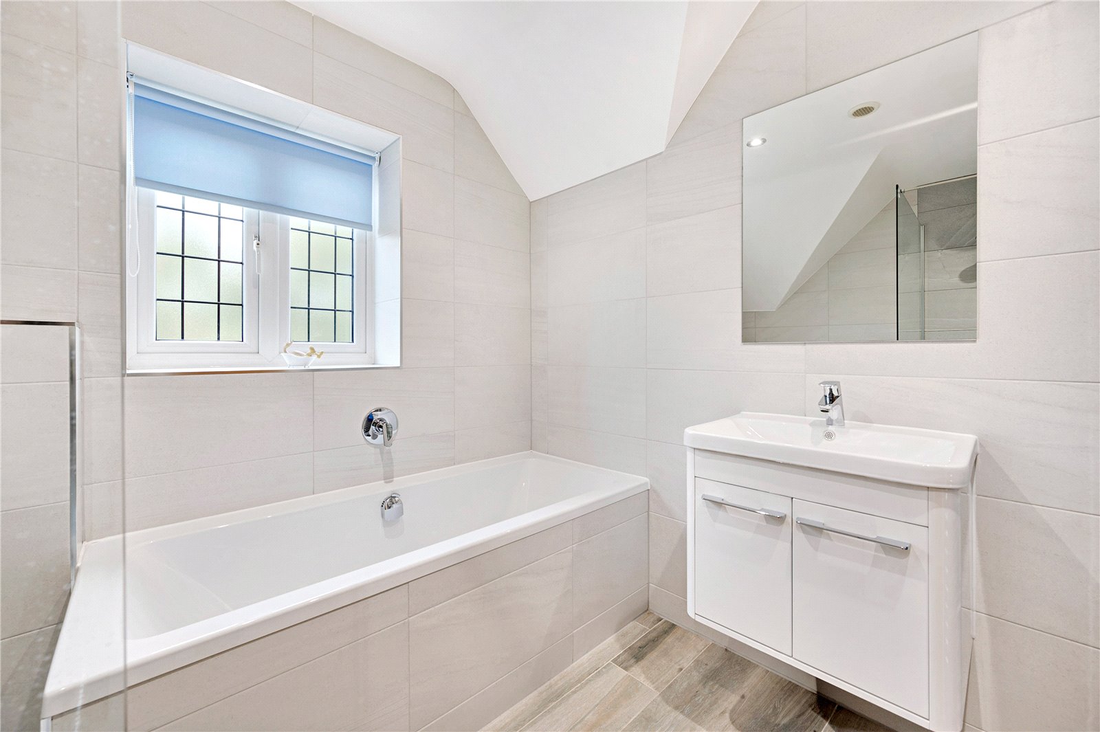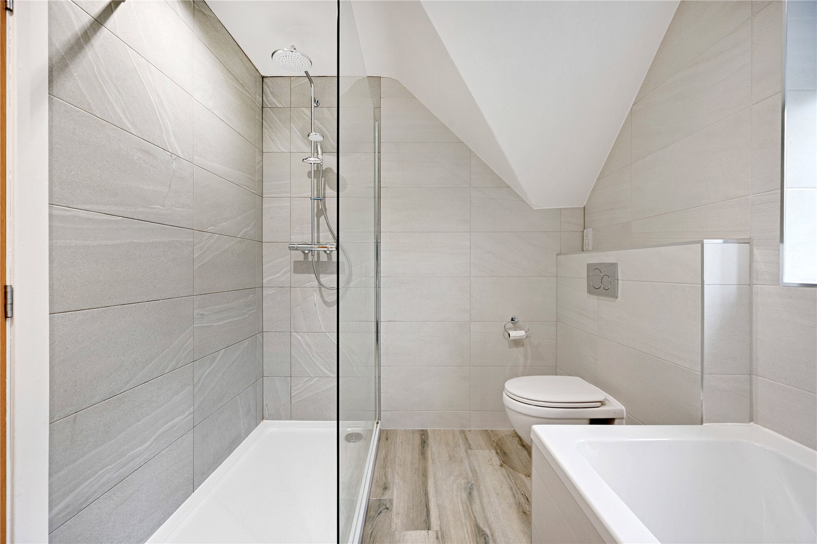 The family bathroom is beautifully appointed with a four-piece suite including a freestanding bath, wall-mounted WC, porcelain vanity basin with storage, and a double rainfall shower. Fully tiled walls and flooring, a ladder radiator, and recessed lighting add to the luxury.
