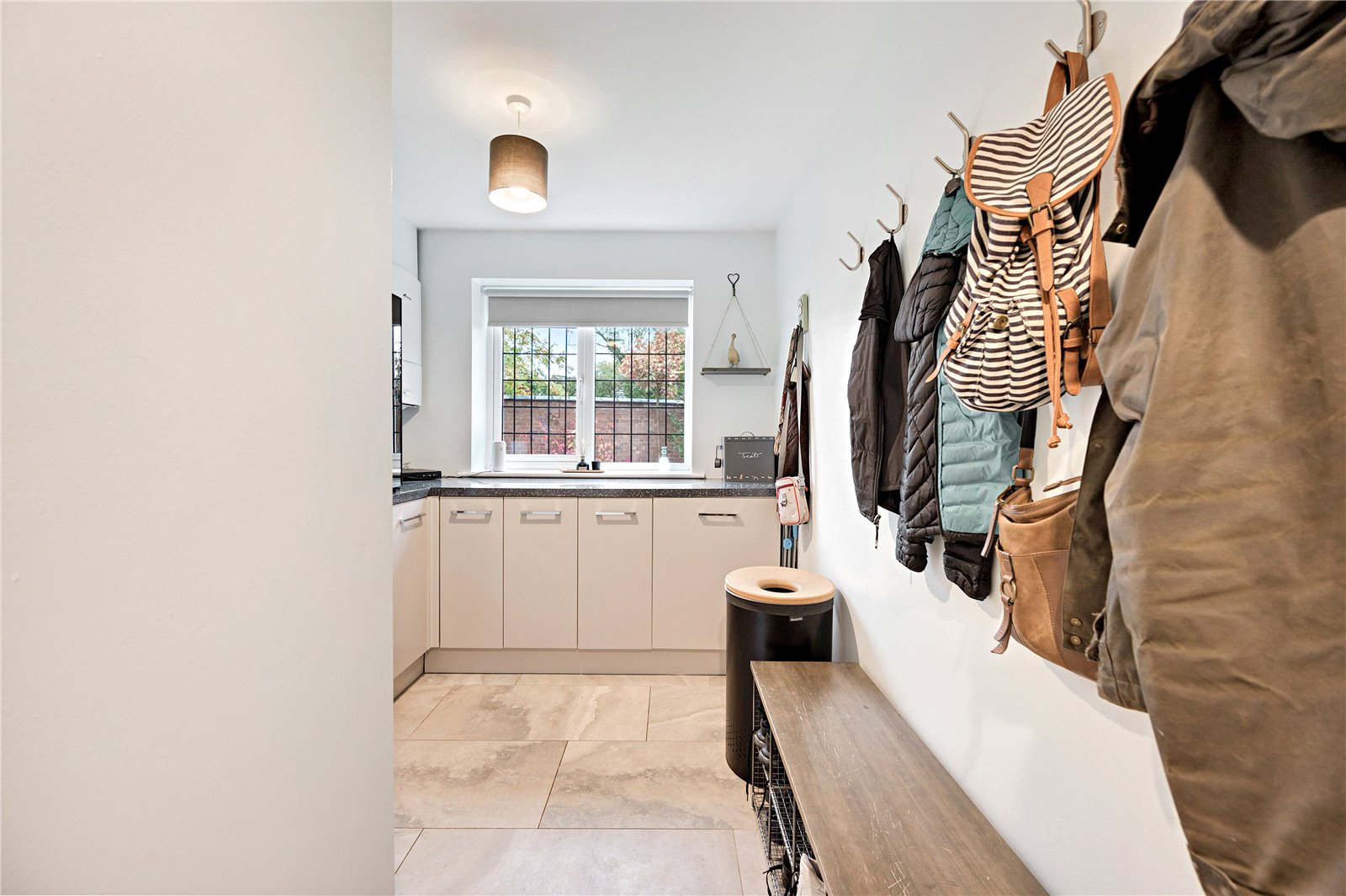 A stylish and practical utility room provides additional granite worktops, integrated washer and dryer, a wine rack, and storage, with a Georgian-style window and Worcester boiler.