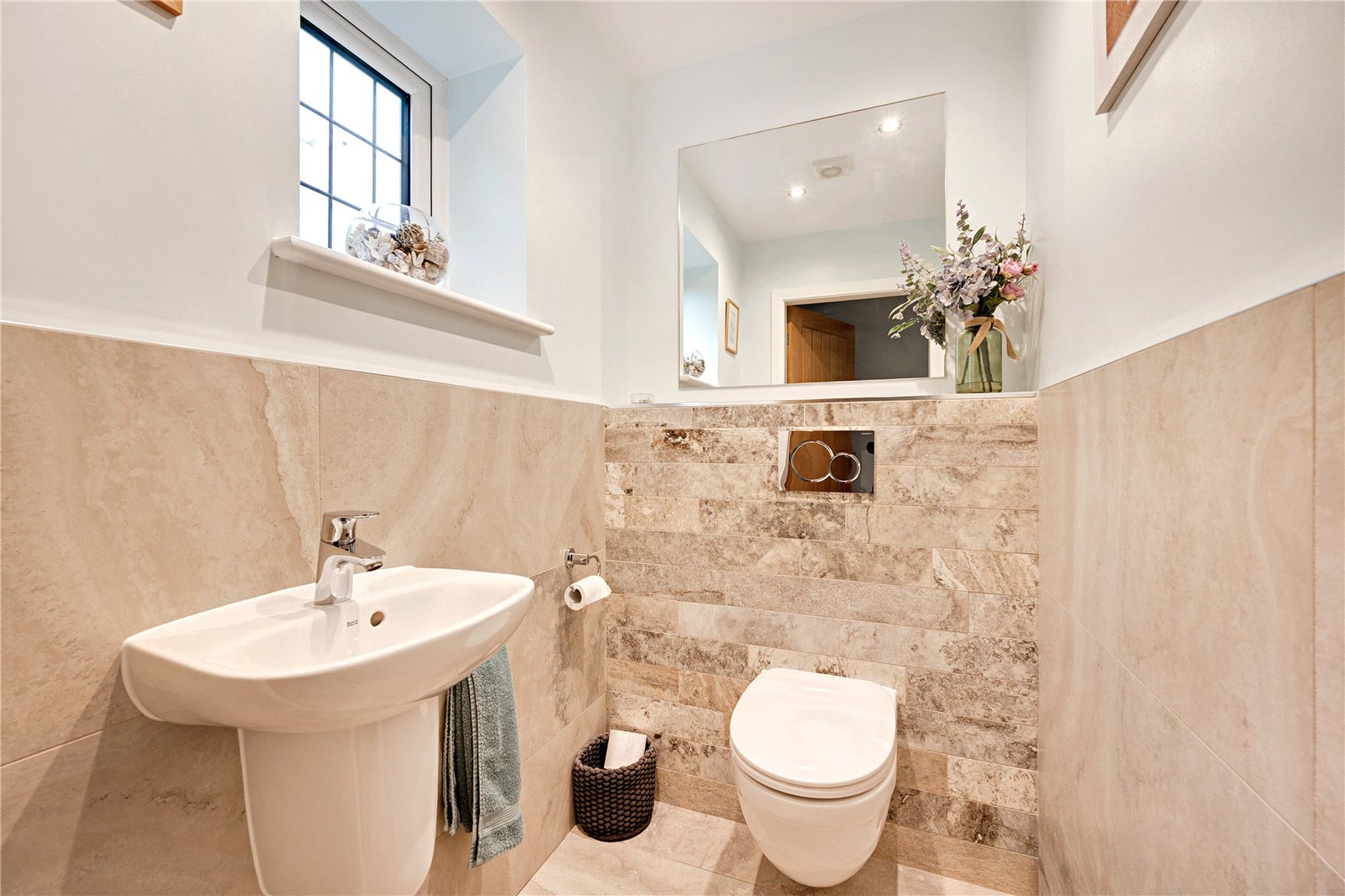 The inviting hallway sets the tone with Italian floor tiling, underfloor heating, and a composite entrance door. A useful under-stair cupboard adds practicality, while the cloakroom is finished with part-tiled walls, sleek fittings, and Italian tiled flooring. The lounge offers a warm and relaxing setting, featuring a wood-burning stove with inset design, Georgian-style French doors, and a rear garden outlook.