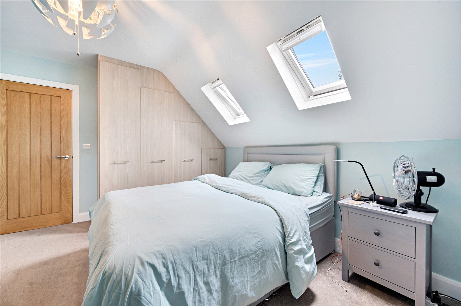 Bedroom two offers fitted wardrobes, twin Velux windows, a side Georgian-style window, and loft access. Bedroom three, also a generous double with twin Veux windows, mirrors the second with matching fitted storage and window features.
