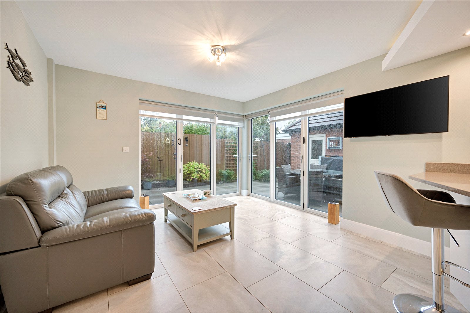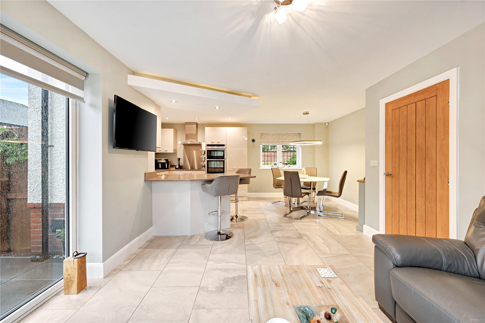At the heart of the home is the superb kitchen diner, fitted with granite work surfaces, a 1½ inset sink, and a full range of integrated Neff appliances including an induction hob, double oven, fridge freezer, and dishwasher. The dining area is complemented by a contemporary pendant light and opens seamlessly onto the rear garden via twin bi-folding doors with electric blinds. Neon lighting and ceiling spotlights complete the modern finish.