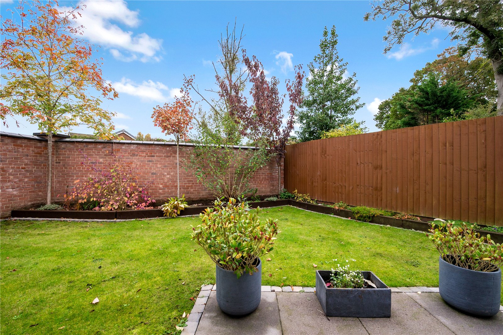 The landscaped rear garden provides a private outdoor retreat, featuring a combination of lawn and patio areas. An outdoor kitchen unit makes it ideal for entertaining, while mature shrubs, flower borders, and decorative gravel add to the charm.