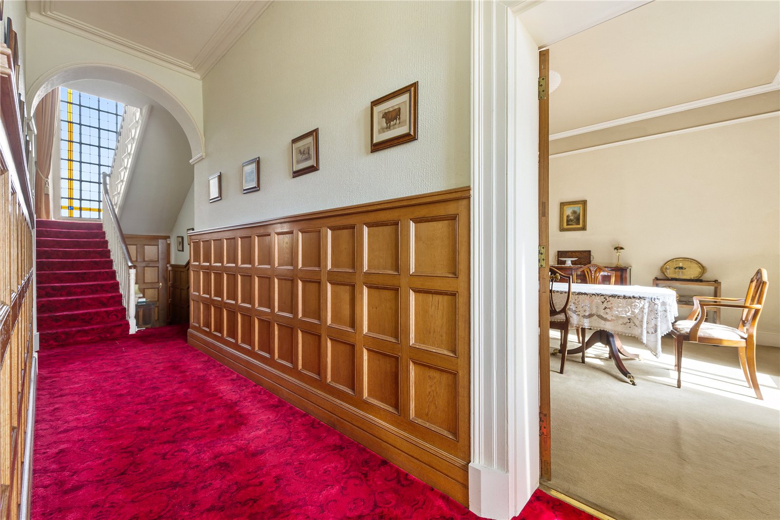 The residence itself has an attractive façade and a central entrance which opens into a beautifully proportioned panelled hallway. This space is flooded with natural light from a striking full height window, creating a sense of space and character.