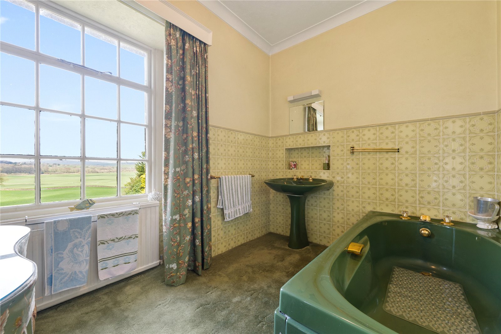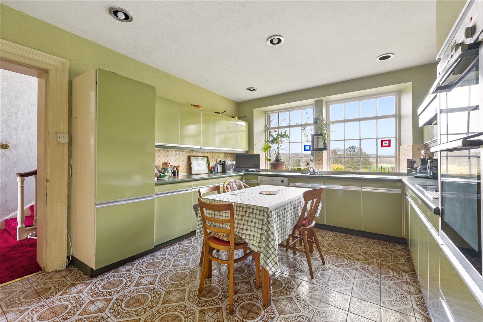 From the hallway, there is a choice of two reception rooms. A smaller, more intimate room provides an ideal setting for everyday living, while the principle reception room offers a more formal entertaining space, which is set around a feature fireplace. This “L” shaped room has windows to three aspects, making the most of the views and outlook. A separate dining room enjoys attractive views to the front and conveniently connects to the kitchen via a traditional serving hatch, making it well-suited for both family meals and entertaining.