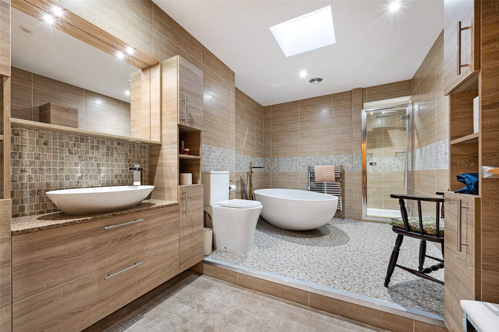 The principal bedroom is generous in size and has a large range of fitted wardrobes. A sumptuous ensuite is also included. The second and third bedroom and family shower room are found off the main hallway. Each of the bedrooms have fitted wardrobes.