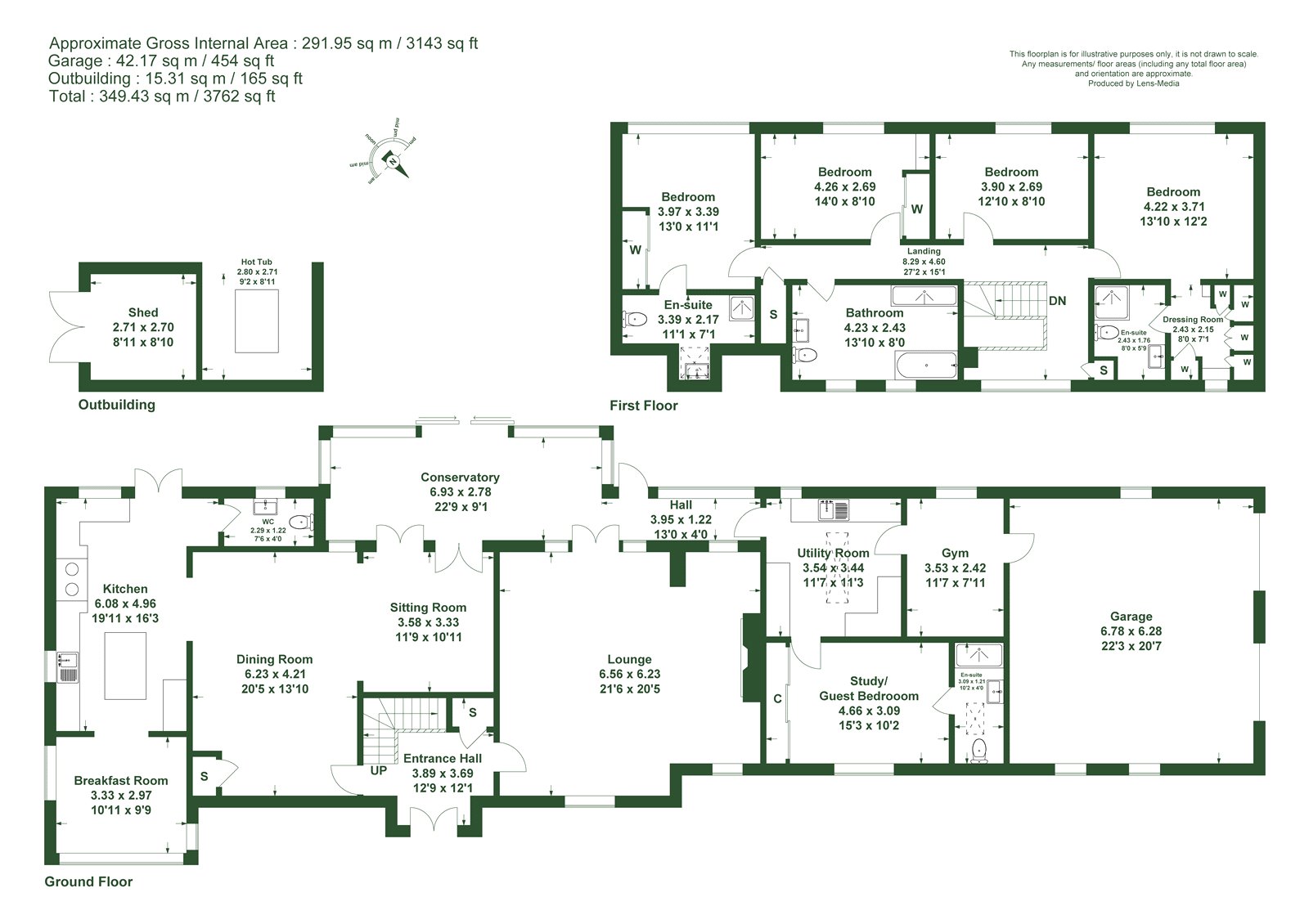 There is an expanse of patio at the rear making a great space for entertaining outdoors with a large lawned area and a further seating area. The vendors have put in a timber building which is part used to cover a hot tub and part as storage.