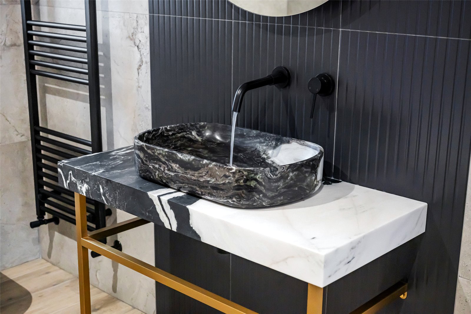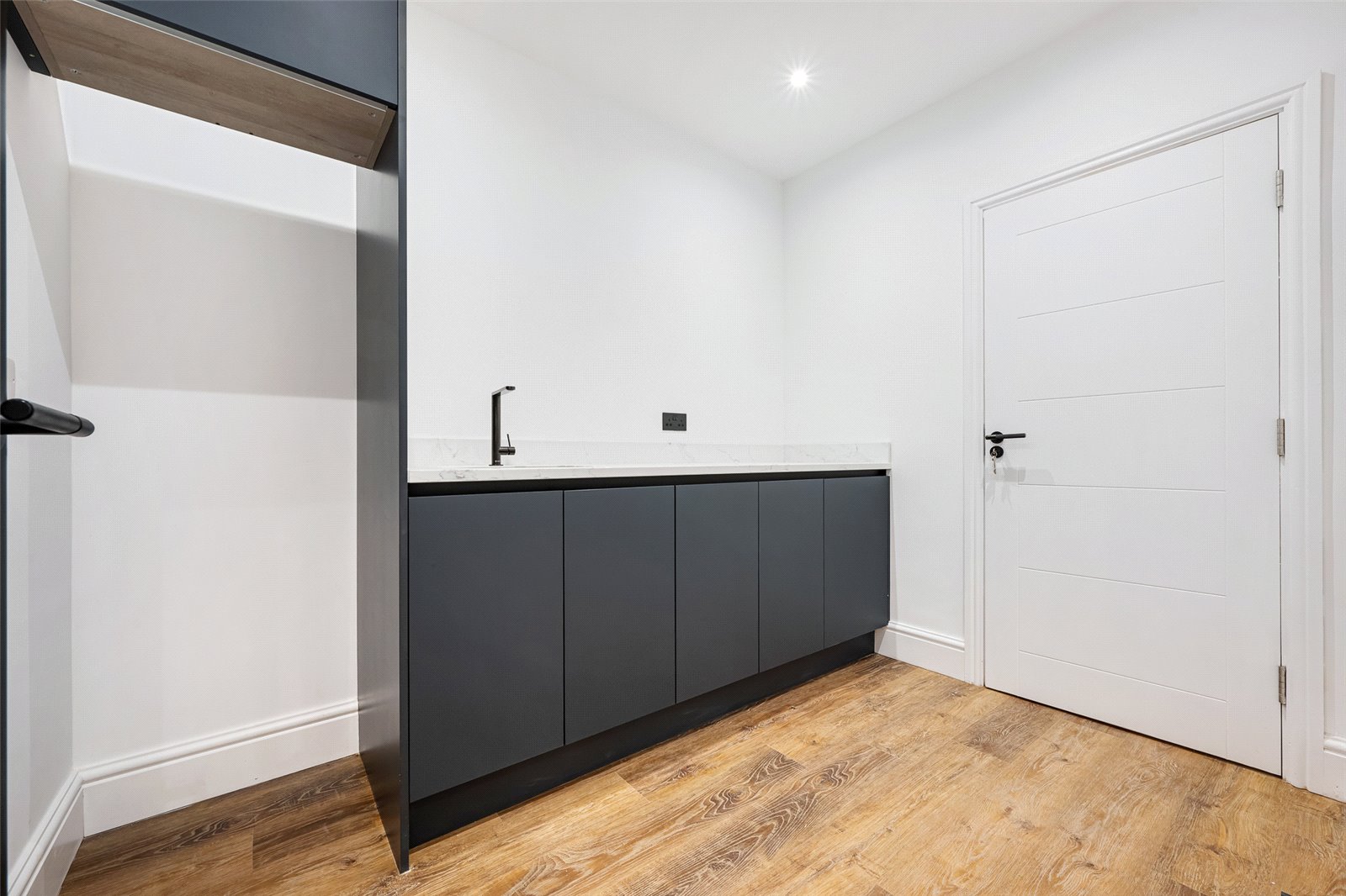 There is ample flexibility for both dining and lounging, allowing the layout to be tailored perfectly to the purchaser’s lifestyle. The kitchen itself is fitted with a sleek range of contemporary units, complemented by a central island with a breakfast bar. Integrated appliances include a hob with built-in extractor, two ovens, a dishwasher, hot tap, fridge and a freezer.
