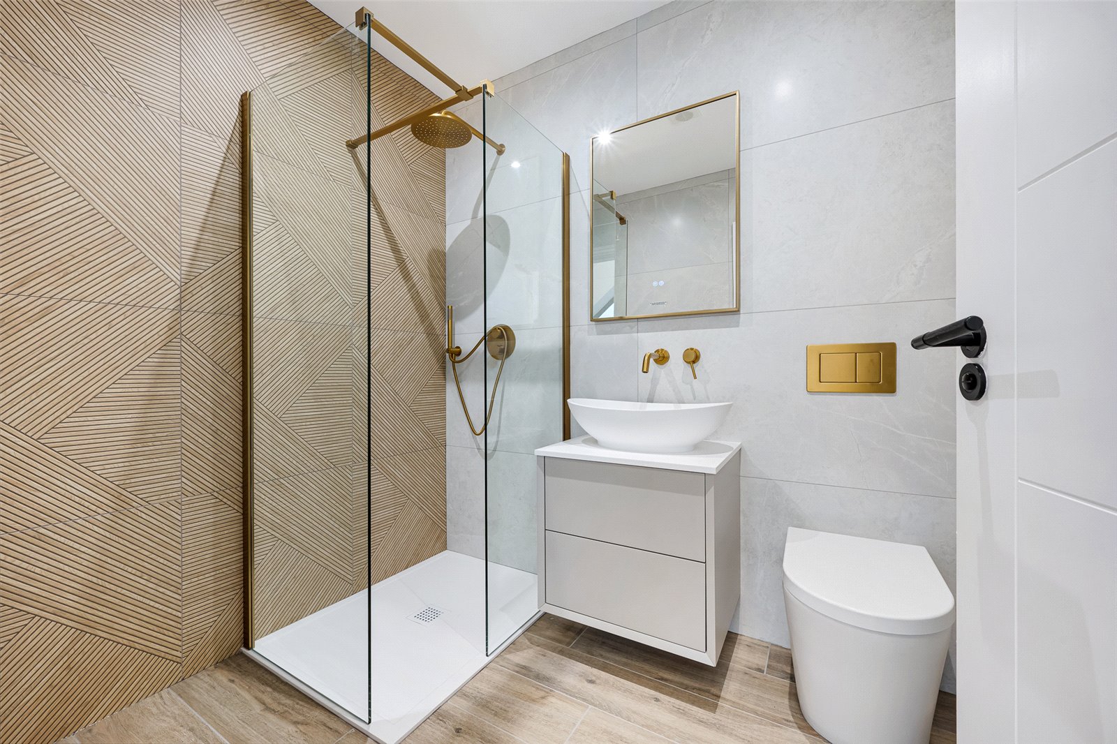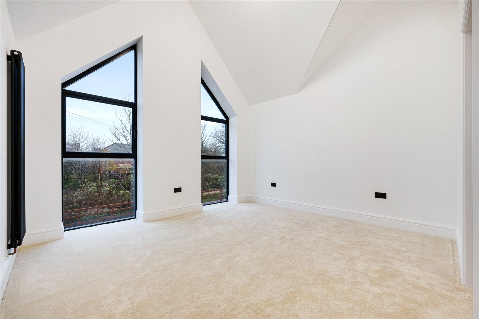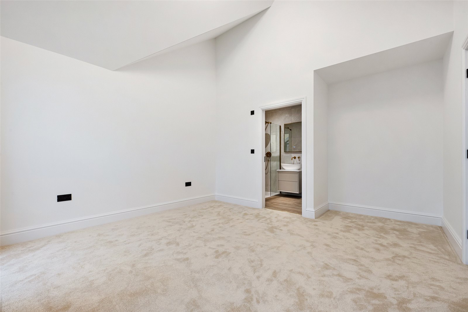 The Principal Bedroom spans the full width of the property and is truly exceptional. An impressive and generously sized room featuring a Juliet balcony and additional rear-facing windows. A partial dividing wall subtly zones the sleeping and dressing areas, bringing both style and practicality. The sumptuous en-suite is equally impressive, offering a double-ended bath perfectly positioned in front of a feature window, a walk-in shower, twin washbasins, and a WC, all beautifully finished with panelling and LED detailing.