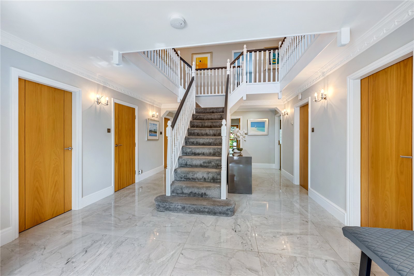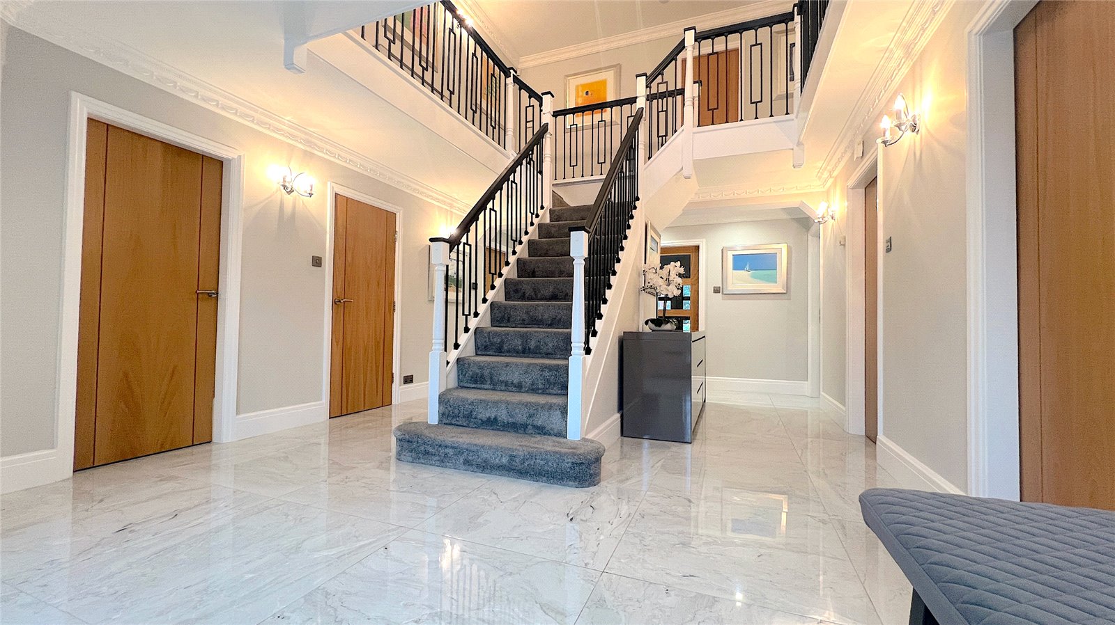 The property has a low wall and impressive steel railings at the front with electrically operated gates opening to a spacious block paved driveway which sweeps through the front of the property providing plenty of parking and leads through to the four car garaging. There is an open porch at the front of the property and the front door opens into a spacious entrance hall.