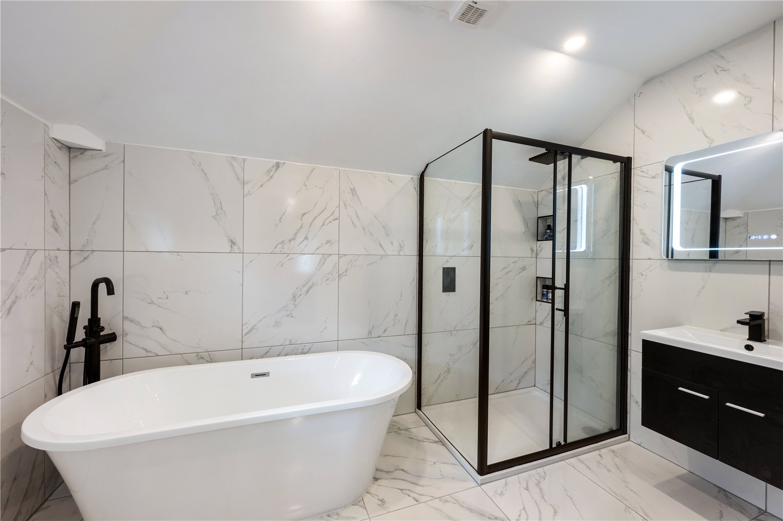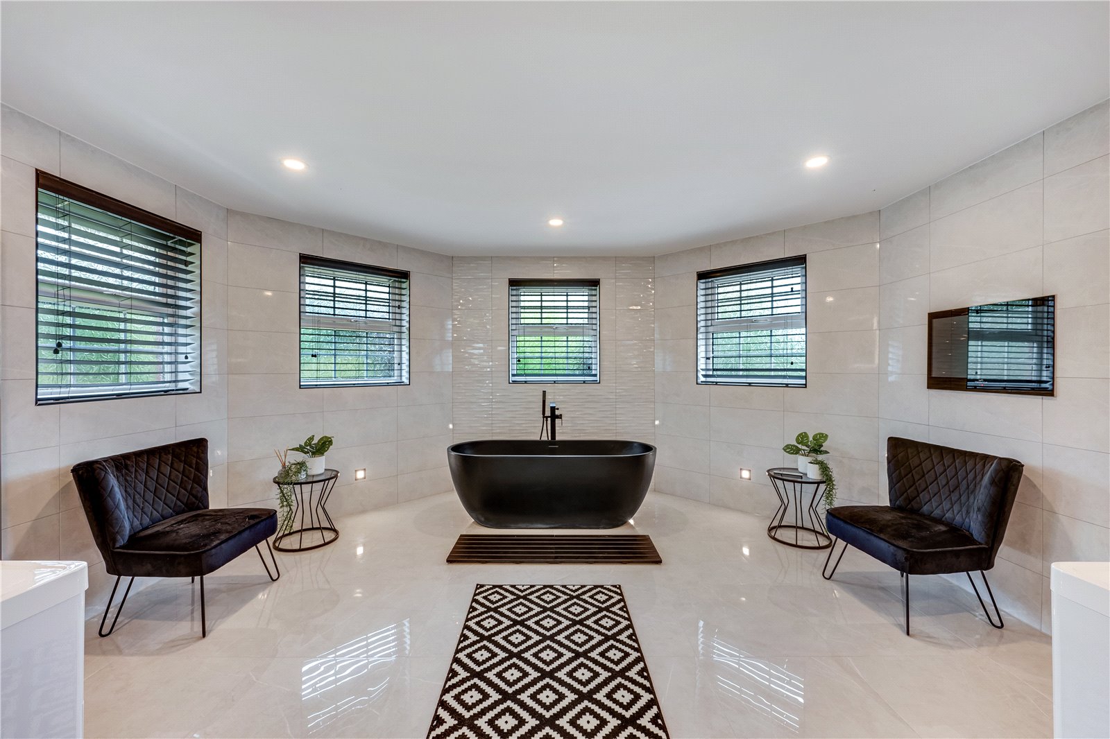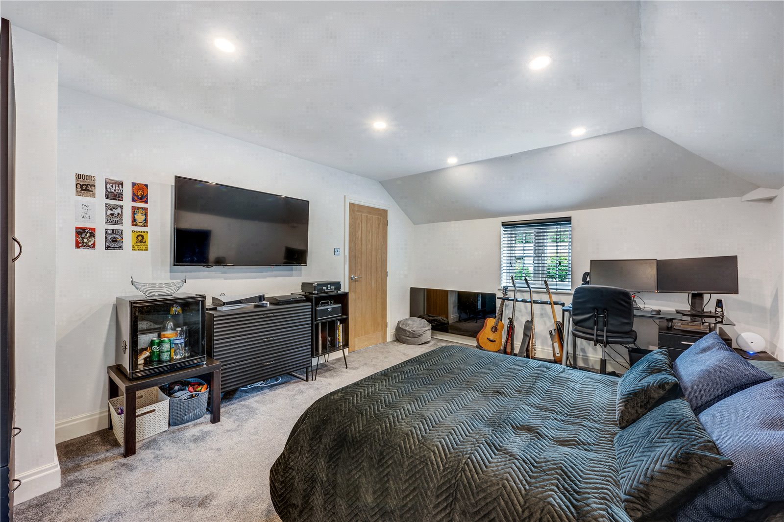 The staircase rises up to the first floor spacious landing where there are doors which lead through to four bedrooms in total. The principal bedroom is an incredible space with the bedroom area enjoying views to both the front and side of the property. There is a range of fitted furniture and steps up to a wonderful dressing area which includes a range of fitted wardrobes. The stylish ensuite has a double ended black bath with a large walk-in shower and twin wash handbasins set in a unit. There is a wall mounted TV in the ensuite. There is underfloor heating in this space and a heated towel rail.