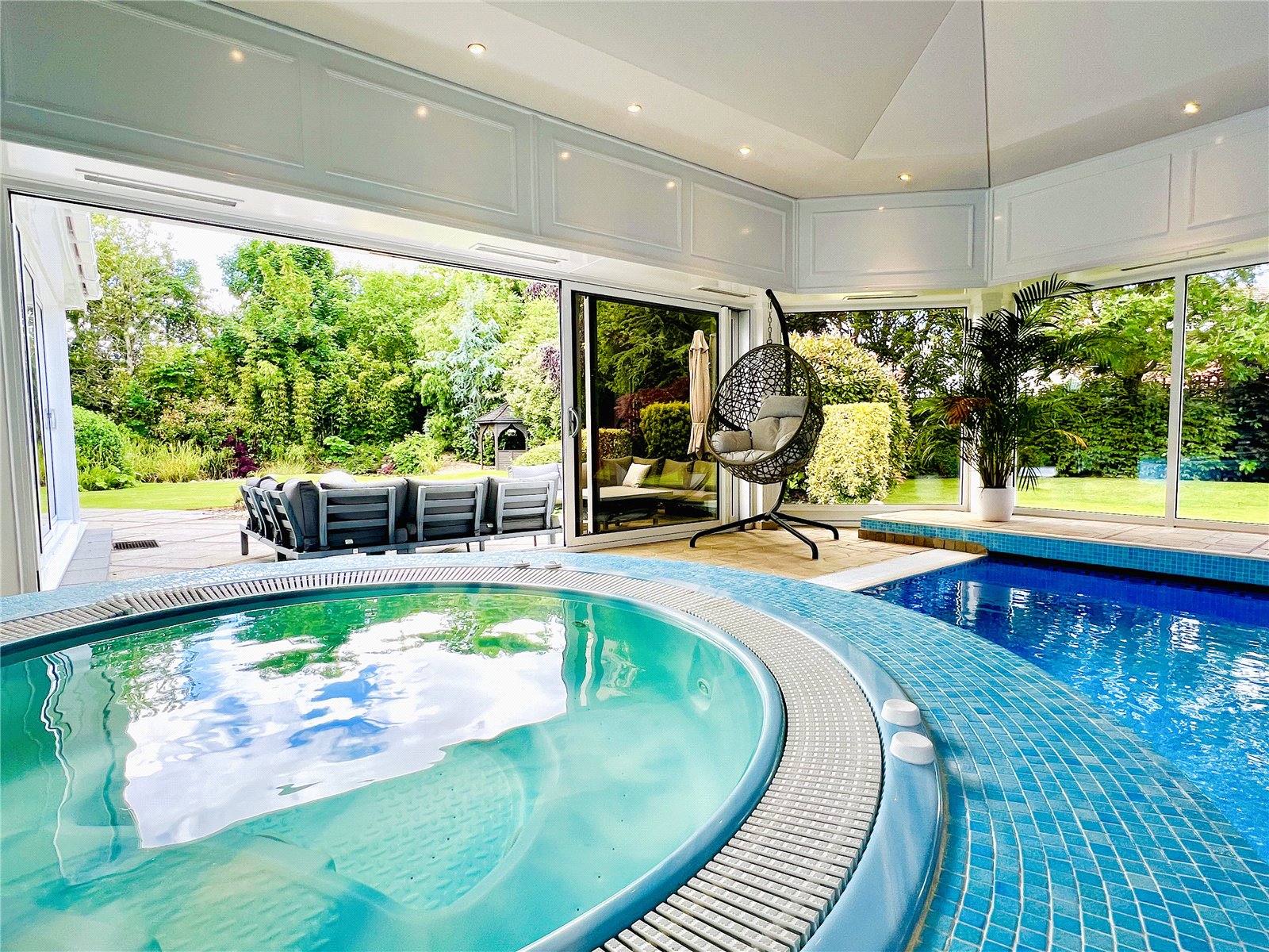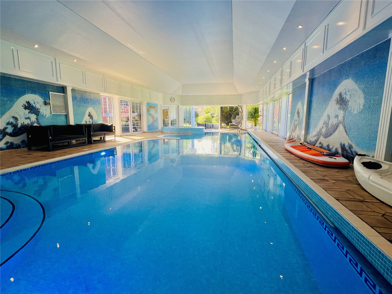 The interior has been improved and finished to a high standard, creating a turnkey home that blends the classic with modern comforts.  The expansive layout offers flexible living and entertaining spaces, ideal for both everyday family life and entertaining.  The indoor swimming pool, a particular highlight, is perfect for relaxation and leisure.  The well stocked mature gardens offer high levels of privacy at the rear.