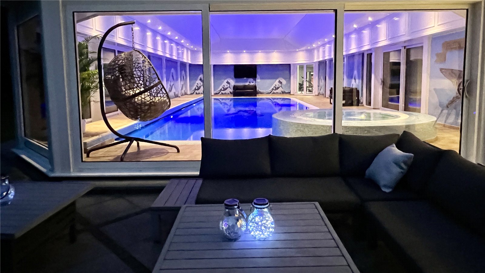 The swimming pool room is a fantastic space with a 14 metre heated pool and inset changing LED lighting along with an adjacent hot tub with body massage jets. The flooring is tiled, there is a large screen TV and doors which lead out to the garden and grounds and also to the gymnasium and changing room facilities. The changing room includes space to change, a shower and a separate WC as well as a fantastic steam room.