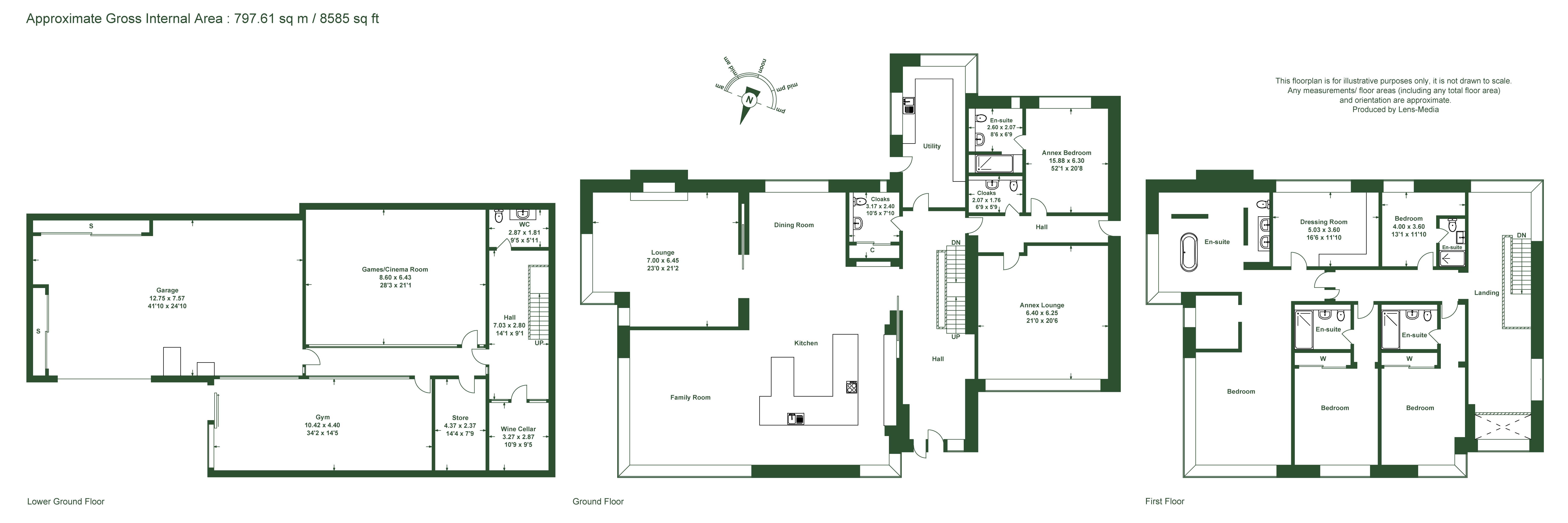 To the lower ground floor there is a wine cellar, separate W.C. large gym and games room / cinema room. Within this space there is a separate walk-in store room. From a central corridor there is access to the large garage area with parking for 4 cars, this space is equally suitable for additional living space if required.