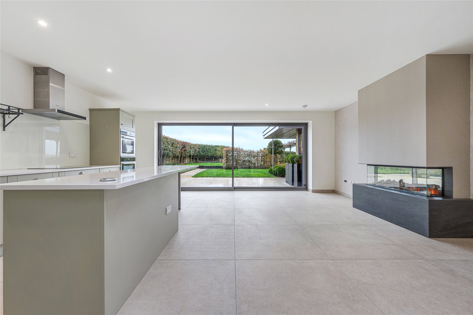 Off the hallway is an impressive living, dining kitchen, fitted with integrated high quality modern appliances. There is a large island with breakfast area overlooking a modern living space, perfect for entertaining, and with sliding glass doors to the terrace.