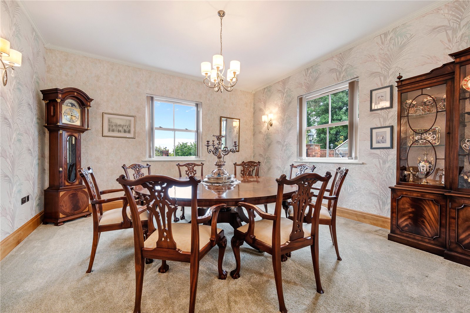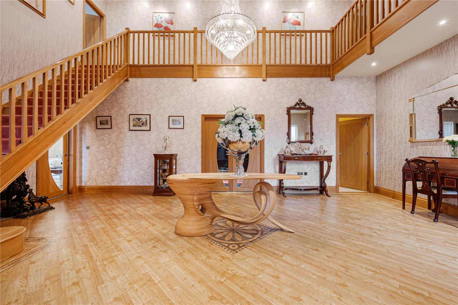 Part glazed double doors open into the entrance porch and further doors open into the impressive dining hall. This wonderful room sets the tone for this fantastic house with dual height ceiling, a galleried landing overlooking the hall and doors off to various ground floor rooms. A spacious WC is provided which has a wall-mounted WC, wash hand basin set in a unit along with a cloak store.