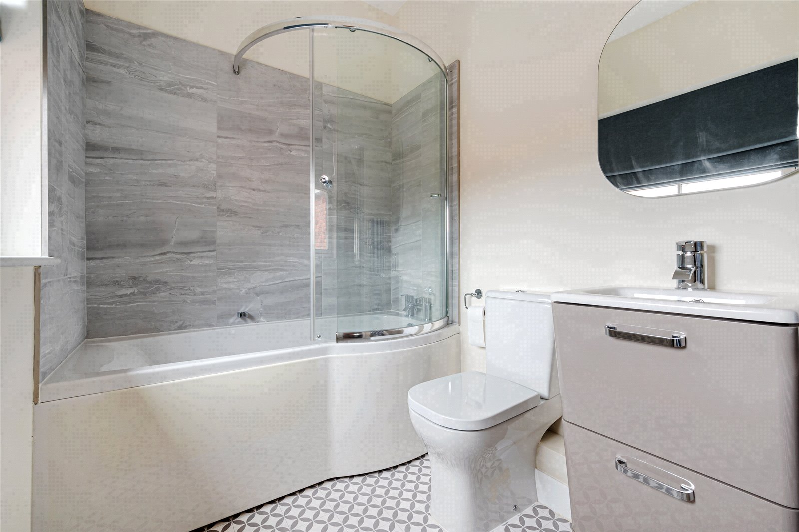 Bedroom Two has windows out to the front of the property, includes a range of fitted wardrobes and has a bath en-suite which includes a ‘P’ shaped bath with a shower over, WC and wash hand basin set in a unit and heated towel rail.