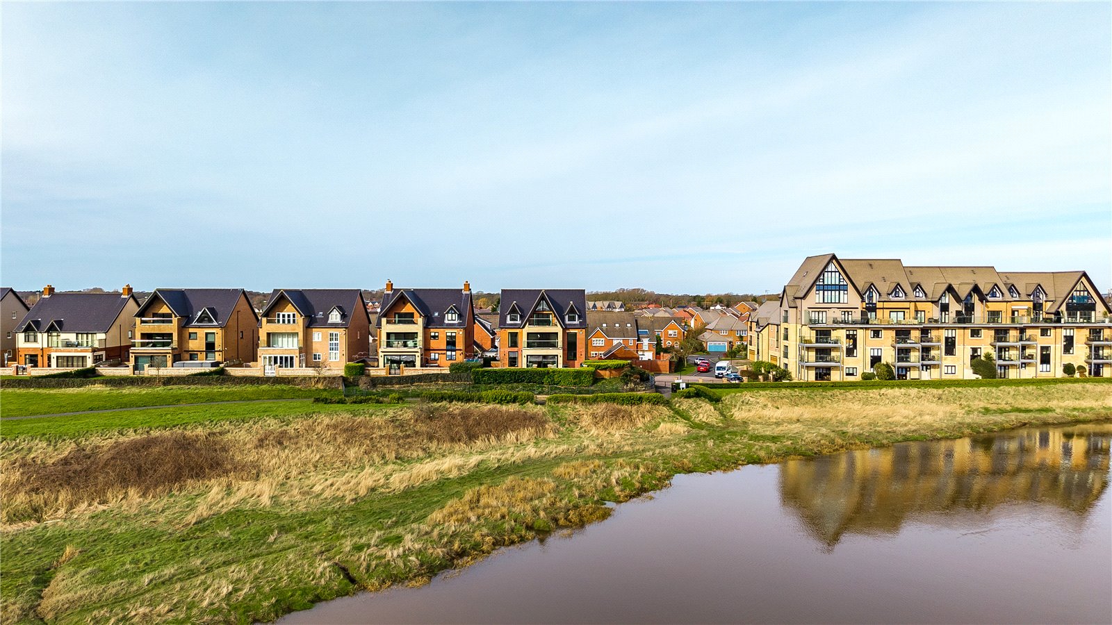 Electrically operated gates open to reveal Vanguard Wharf, a selection of exceptional coastal homes of similar calibre. This home is the first home after the gates and gives a real feel for the road. There is oodles of parking at the side and ahead of the integral garages.