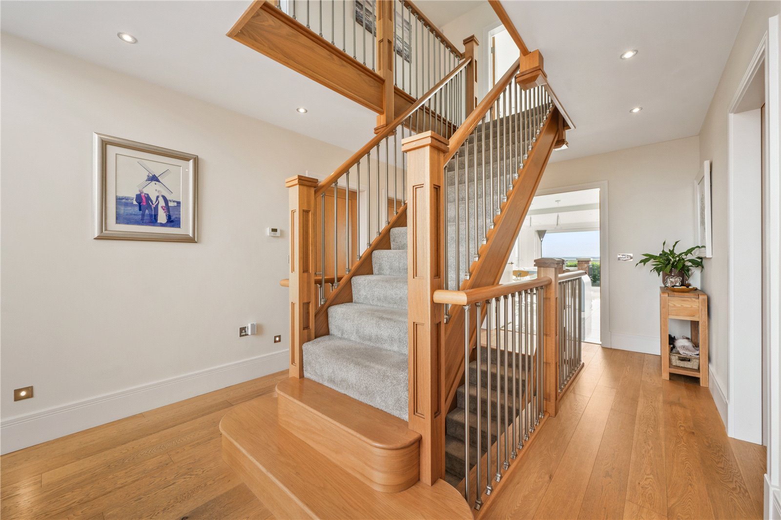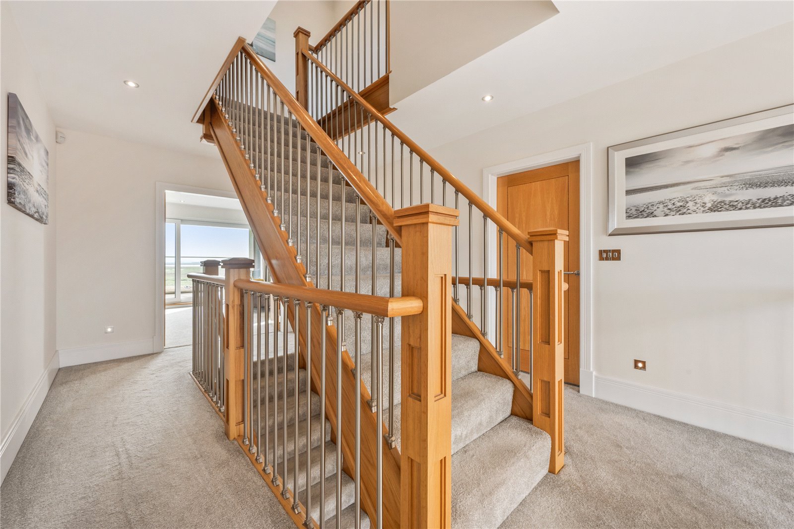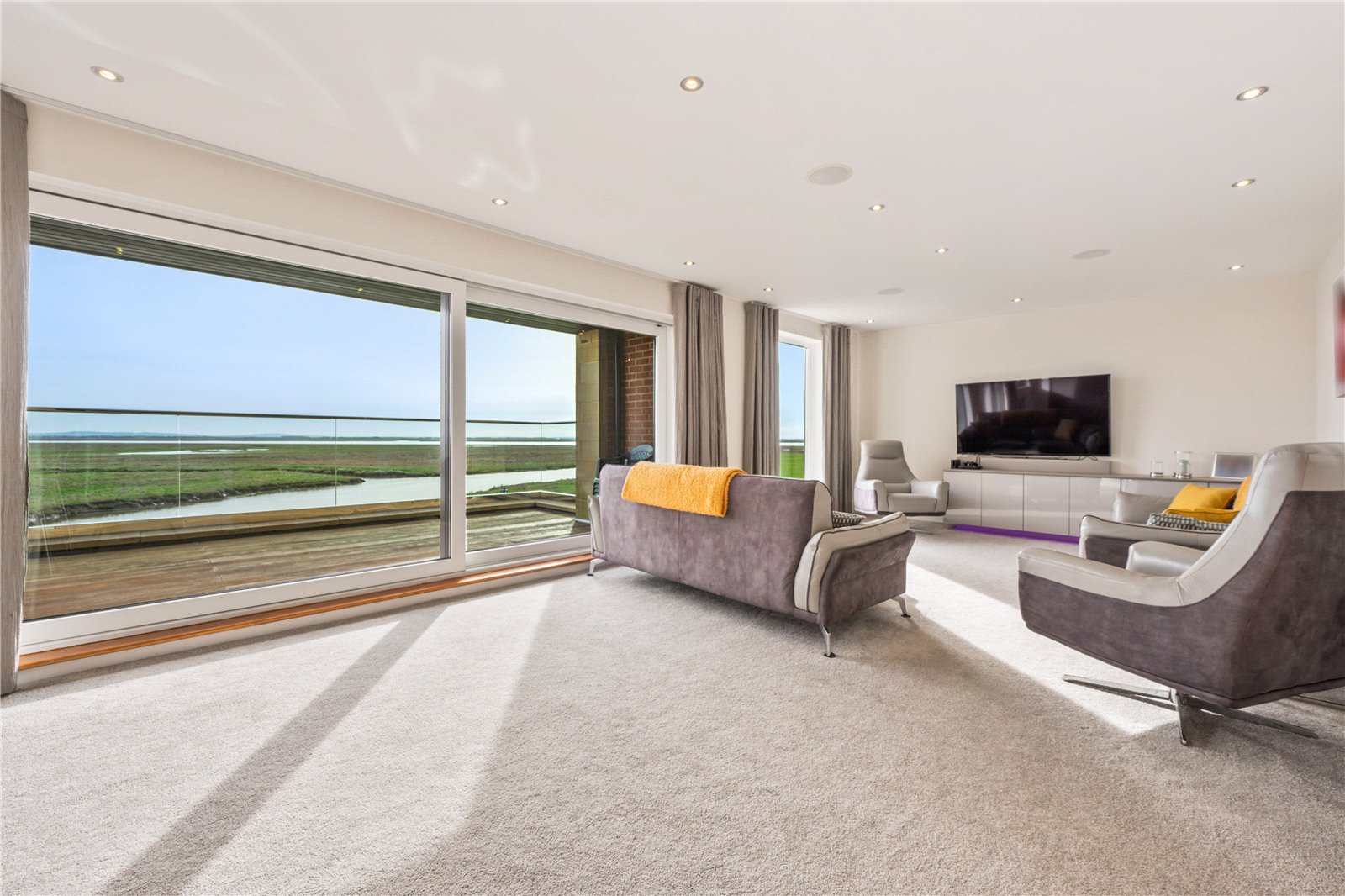 The first floor landing enjoys views to the front. Double doors open into a superb lounge perfectly positioned to capture those glorious views, changing with the seasons, over the Estuary. Sliding doors lead directly onto to the balcony where you can appreciate not only the most amazing views but also the soothing sounds of the water.