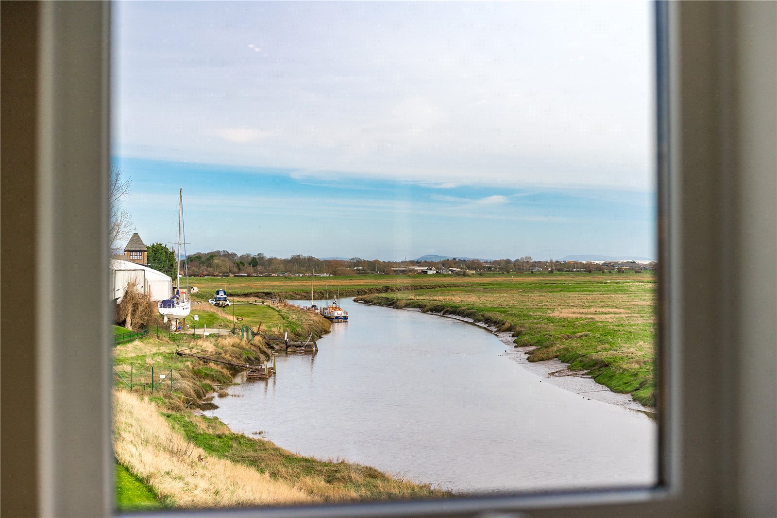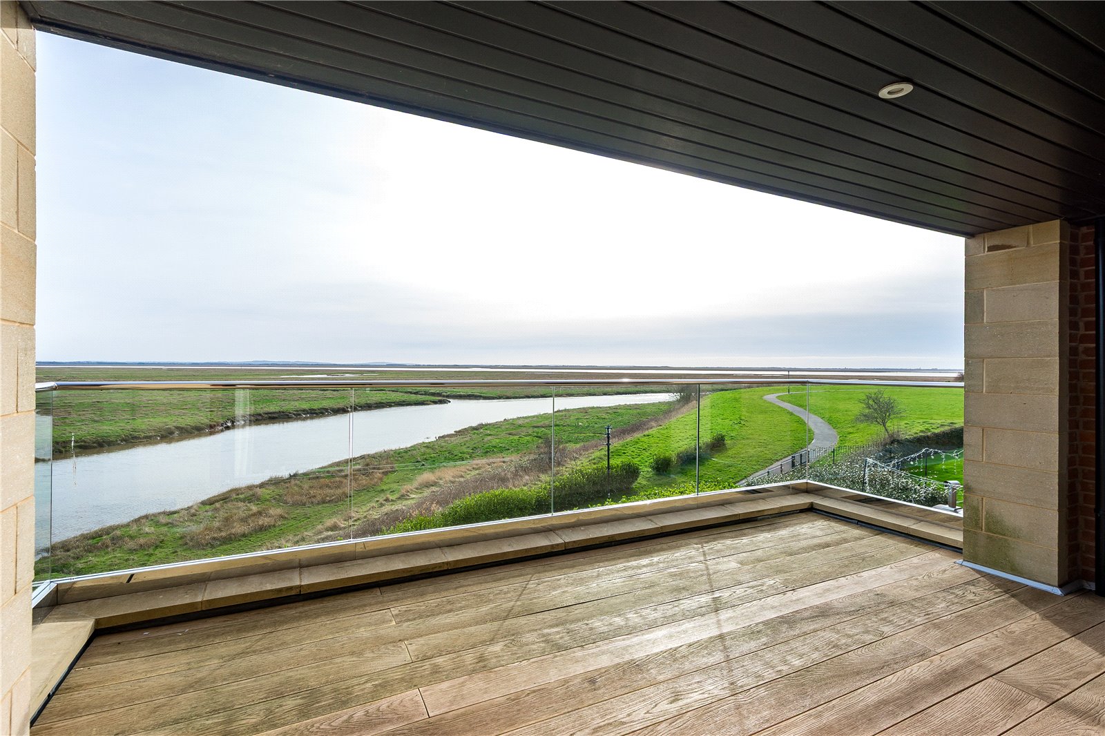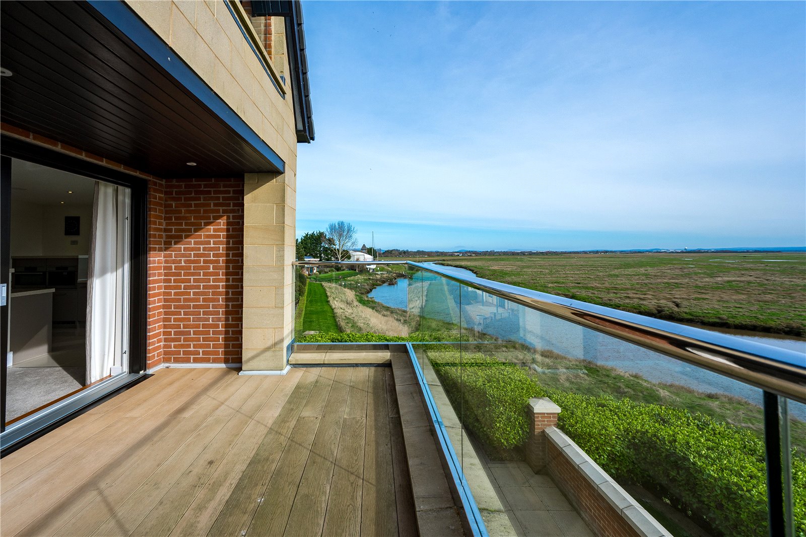 The first floor landing enjoys views to the front. Double doors open into a superb lounge perfectly positioned to capture those glorious views, changing with the seasons, over the Estuary. Sliding doors lead directly onto to the balcony where you can appreciate not only the most amazing views but also the soothing sounds of the water.