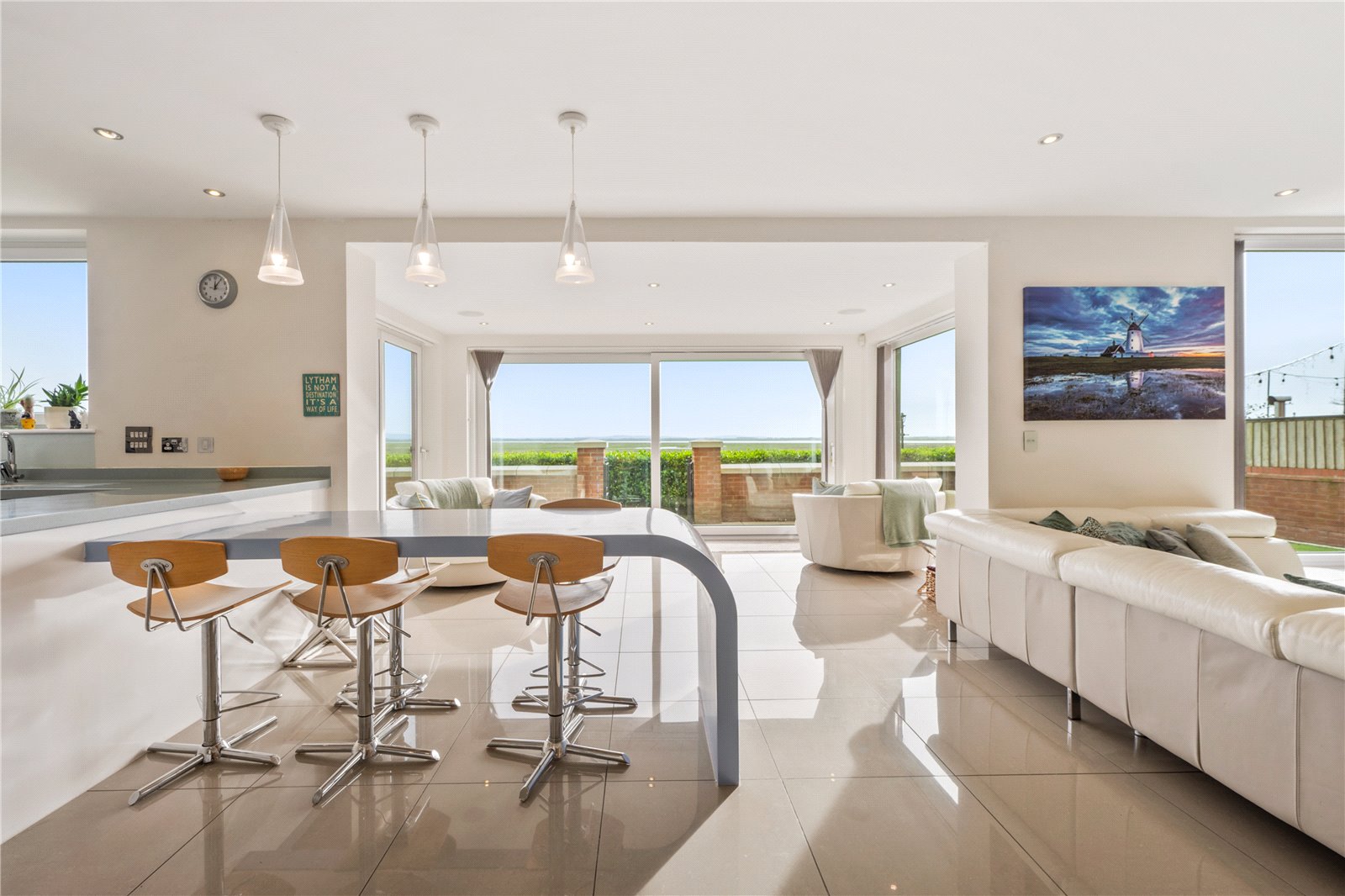From here, double doors open into the incredible living kitchen, where the views are something to behold. The fitted kitchen includes Corian worksurfaces and a built-in table. Integrated appliances include; AEG dishwasher, 2 ovens, coffee machine, microwave, fridge, freezer, induction hob and extractor. There is a generous space for both relaxed seating and dining, with the layout flowing into the adjoining sun lounge area. The large sliding doors invite the sea breeze in and creates an exceptional hub for entertaining both outdoors and in. This room is likely to be the heart of this stunning home.