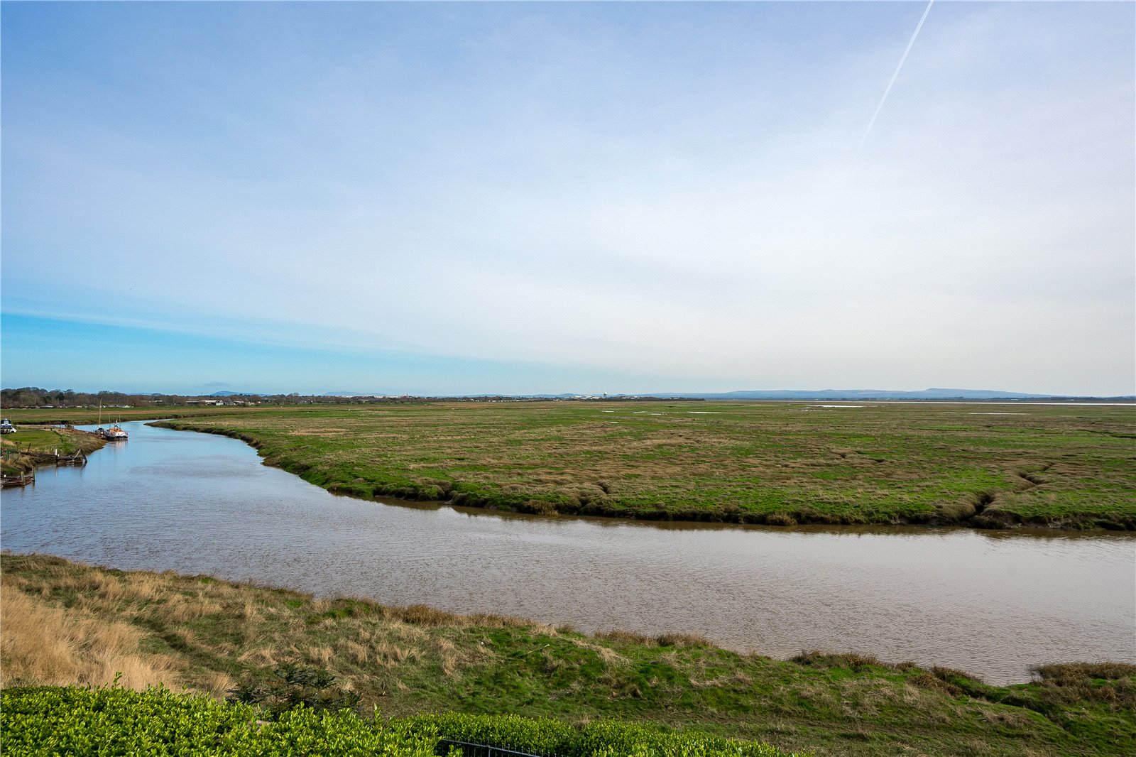 The staircase rises again to the second floor landing. A door opens to reveal a breath-taking principal bedroom suite, the views across the estuary and towards the sea are truly remarkable from here. The patio doors open onto a balcony ensuring that you can make the most of this homes position. This room features blackout blinds, perfect for those mornings where you prefer a leisurely lie-in without the sun spilling into the room. There is a range of fitted wardrobes and a further dressing room with fitted wardrobes.