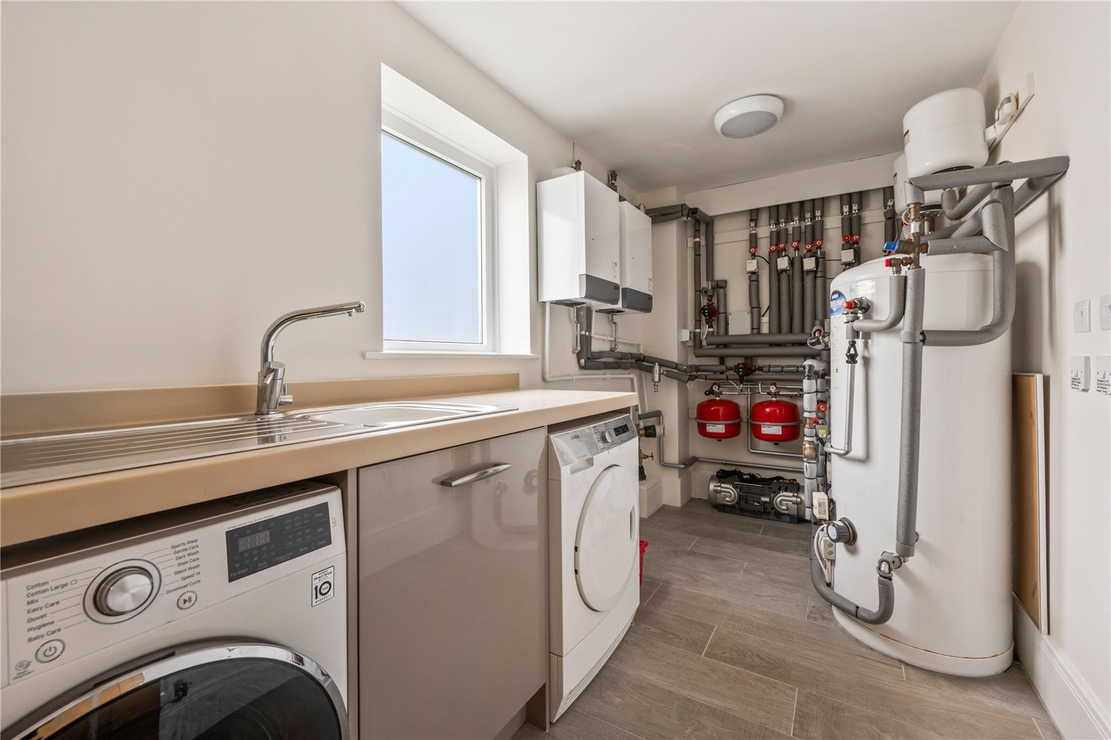 The lower ground floor provides internal access to the two integral garages, along with a utility room and shower room. The utility room includes a range of fitted units with a Corian work surface. There is a space here for a washing machine and dryer. A stainless steel sink adds to the practical element of this room. The Potterton gas central heating boilers and hot water cylinder are also housed here. Karndean flooring completes this space.