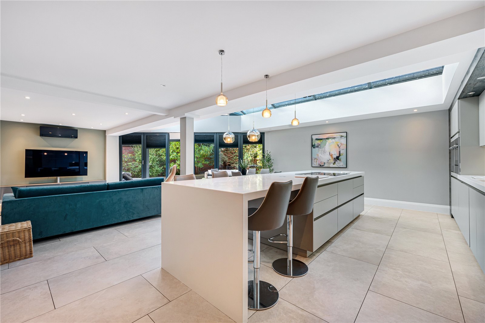 The centrepiece of this superb home has to be the showstopping living kitchen, a place with a real sense of calm, but also a super space to gather family and friends. There is plenty of space for lounging and dining and the bifold door can be thrown open to spill into the outside space.. The bifold doors along with the atrium roof ensure plenty of natural light can flood this room. The fitted kitchen includes a complementary central island with a breakfast bar, again highly sociable ! A range of integrated appliance includes, : hob, extractor, 2 NEF ovens, warming drawer. Gaggenau fridge, Gaggenau freezer and wine cooler. This really is a true family space.
