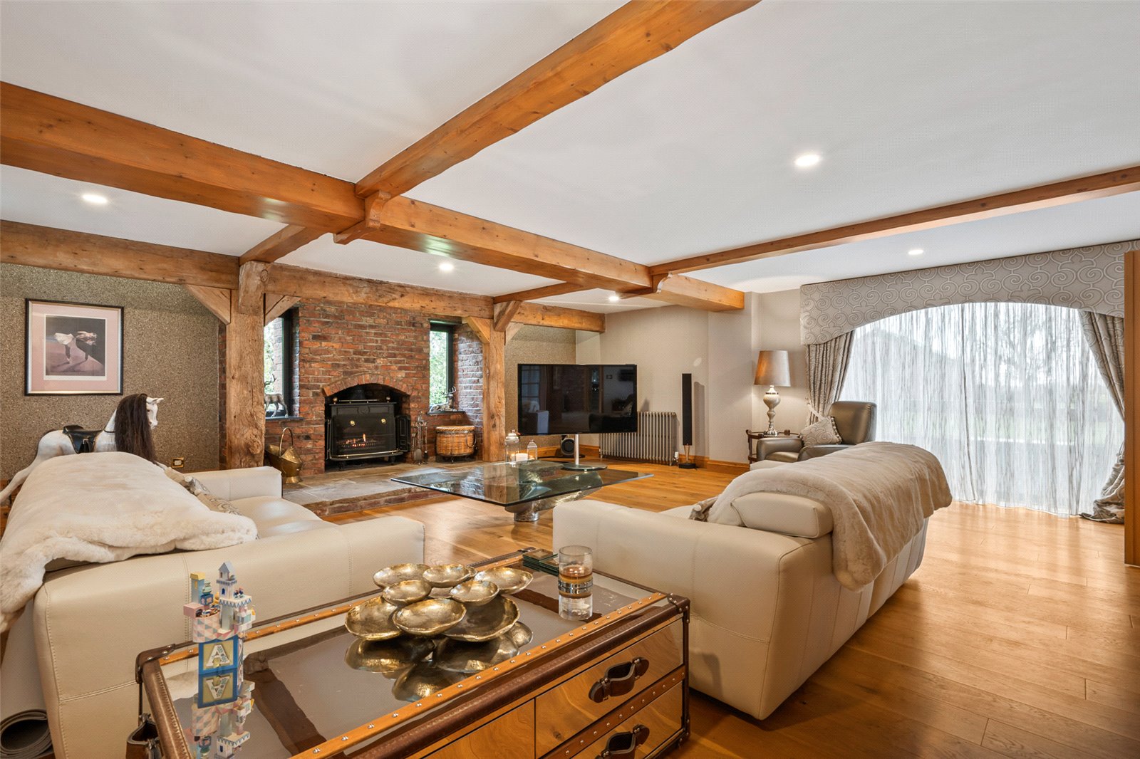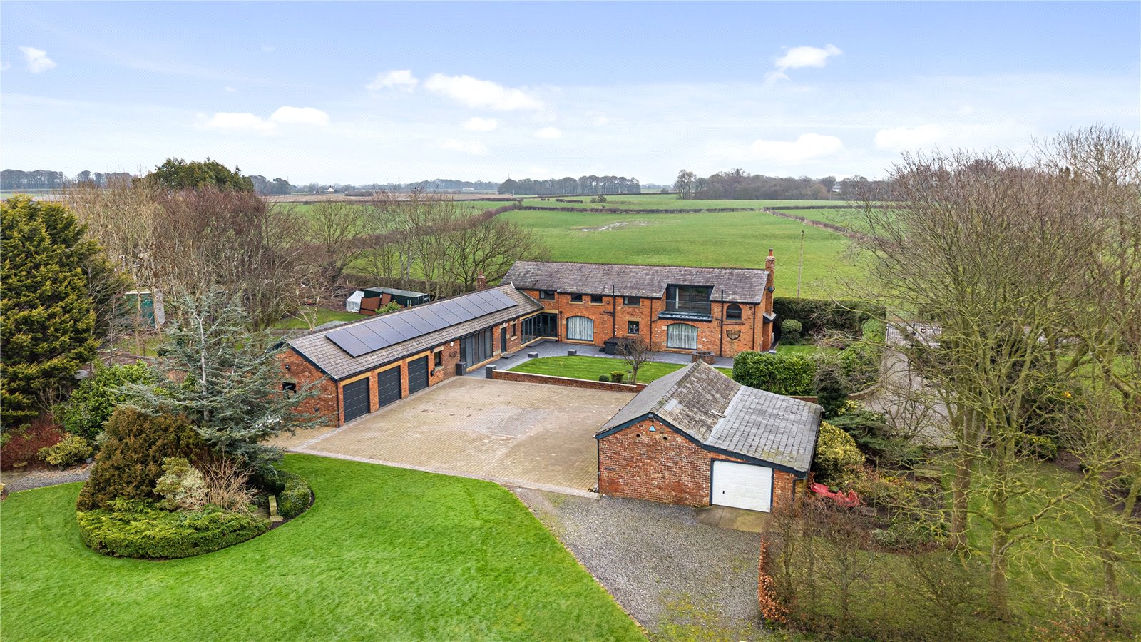 Oozing character and charm this superb award winning barn conversion is sure to impress. A wonderful family sized home including a welcoming dining hall, study, kitchen open to the snug, games room and lounge along with two ground floor WCs and a utility room. The first floor has four bedrooms and four ensuite bathrooms. The gardens and grounds are immaculately presented, there is a large expanse of lawn, mature trees, flower and shrub beds along with a porcelain tiled patio. A brick under slate built building has been used as stabling and has planning permission to alter to create additional space e.g. gym, office and studio. This home lends itself to both family life and entertaining— we cant wait to show you inside!