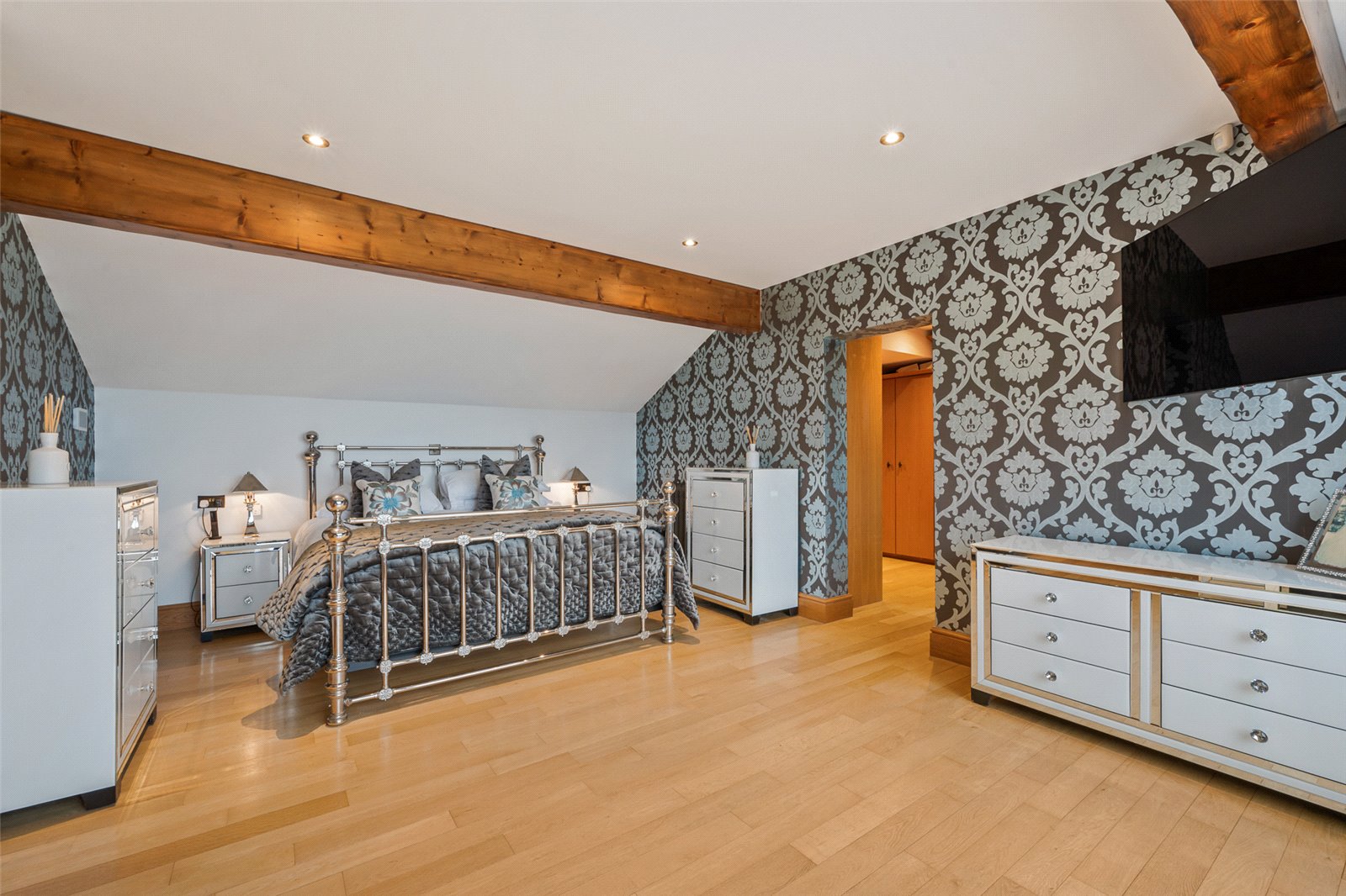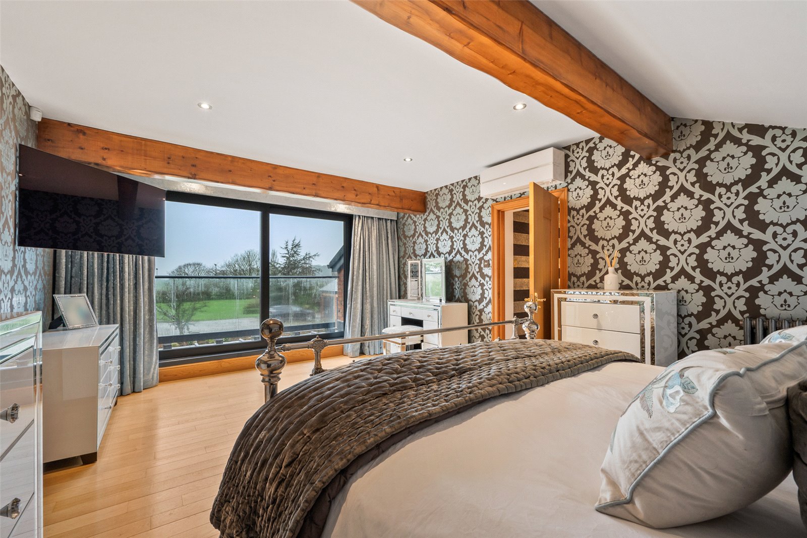 The staircase rises up to the first floor where there is a landing with doors off to various bedrooms. The spacious principal bedroom has a sliding door to a balcony which offers super views out across the gardens and grounds and the countryside beyond. There is an oak floor and a dressing room which is also fitted out by Carl Josef. The ensuite includes a double ended bath, separate shower, wash handbasin set in a unit and a wall mounted WC, there is also heated towel rails & picture window.