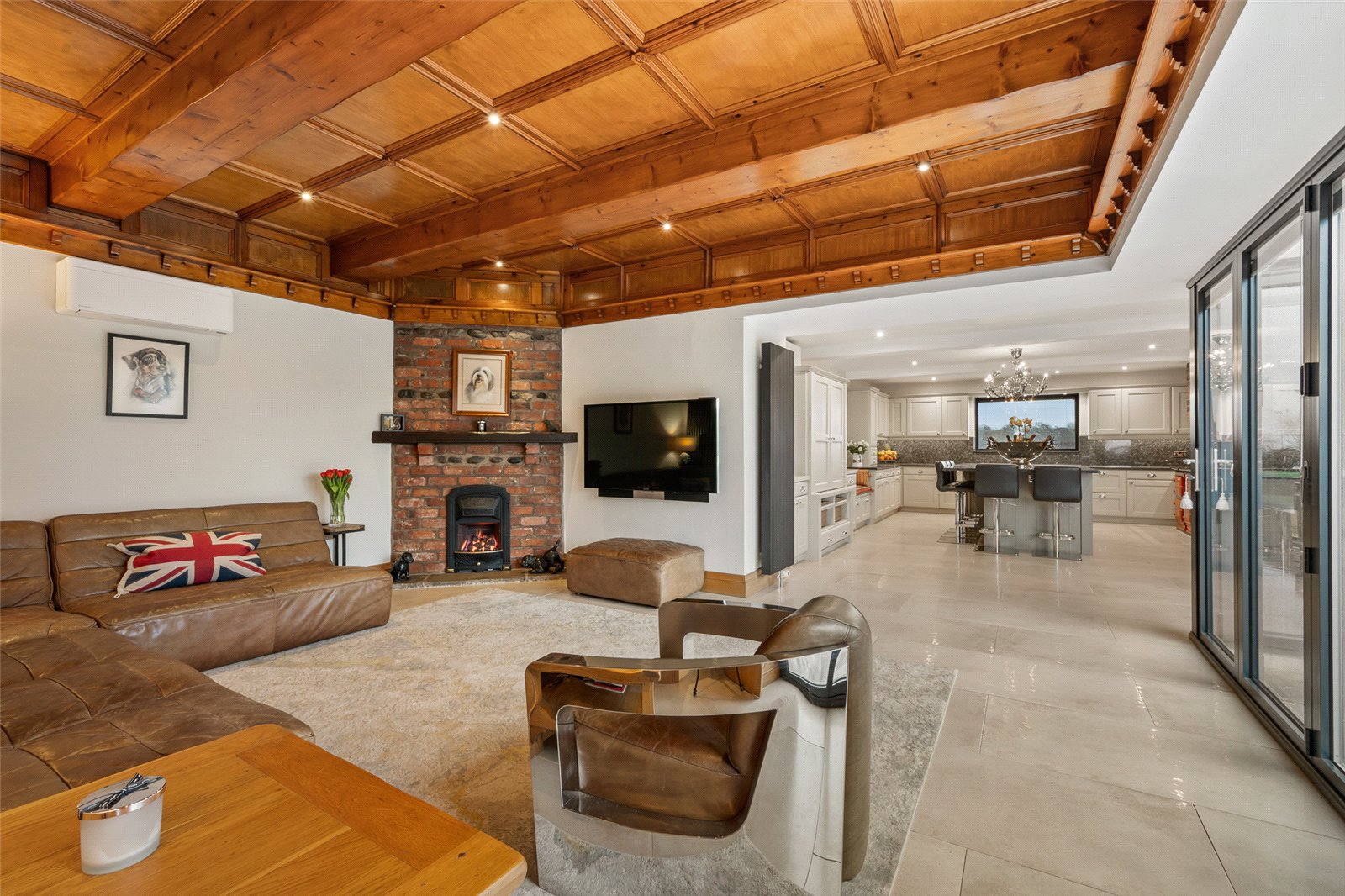 Day to day entry is taken through the back door into a lobby area this opens to the snug which further opens into the kitchen space giving a real open plan style feel. The snug has an attractive fireplace set in a brick feature along with exposed timber work in the ceiling, making an attractive cosy room. This room opens through to the kitchen space where there are cantilevered bi-fold doors with built in blinds which open allowing the outdoors in giving a really modern feel to the room.