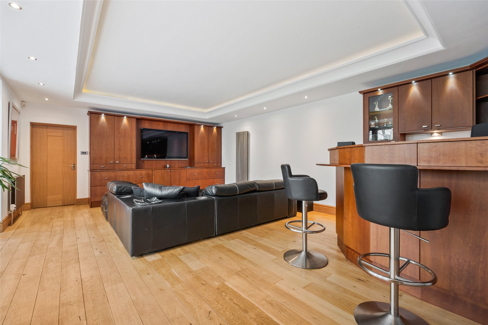 A further reception room is currently used as a games room and has a built in DJ booth/console & bar , further built in Carl Josef furniture along with a TV point. There are bi-fold doors with integral blinds and the floorcovering is in oak. There is a door to the garaging and doors through to the snug.