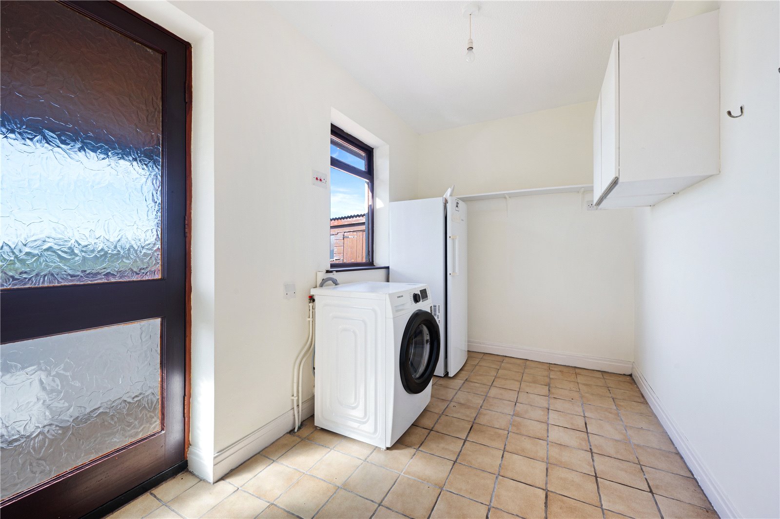 The kitchen is fitted with a range of timber cabinets and features a characterful vintage Rayburn cooker alongside a standalone cooker. Adjoining the kitchen is a generous utility room, which offers access to the rear porch and the attached garage.